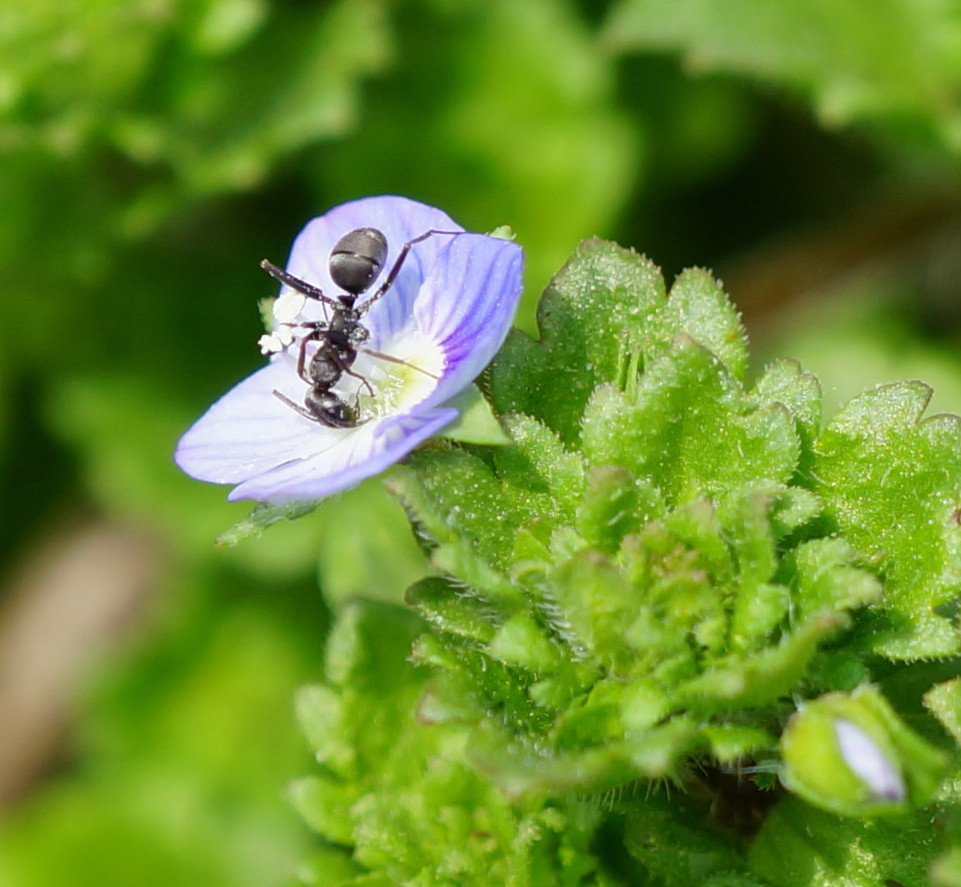 道端の雑草の中に咲き誇るオオイヌノフグリに小さな蟻が夢中に蜜を吸っていた