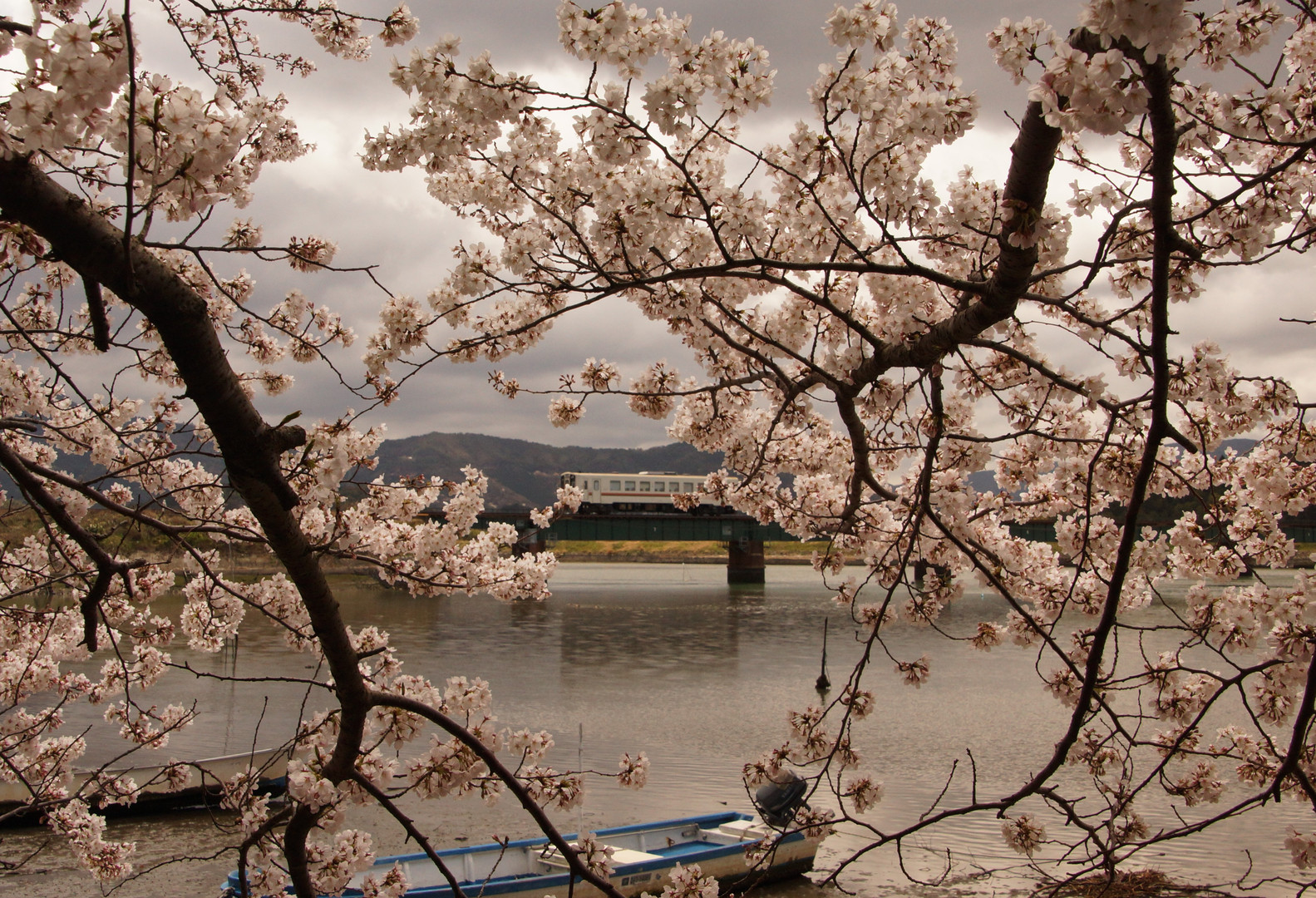 川沿いの桜を窓に想い小舟、電車をいれ撮る。
