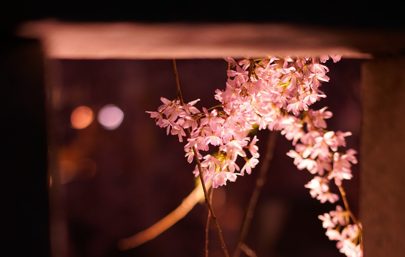 乃木神社、満開のピークを過ぎたころ。 ライトアップされた枝垂桜と街の光をしゃがみ込んで覗いてみる。