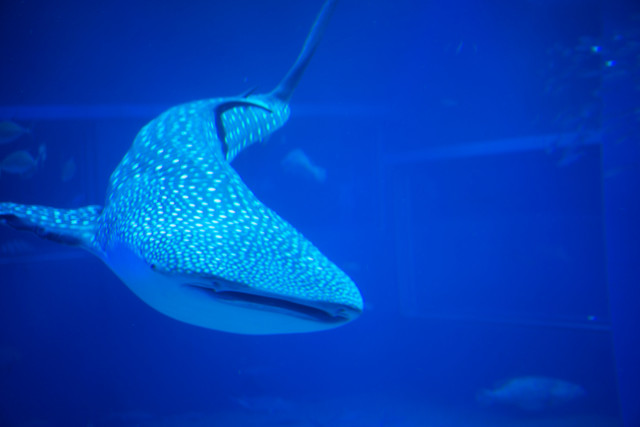 広々とした水槽でジンベイザメが優雅に泳いでいました。