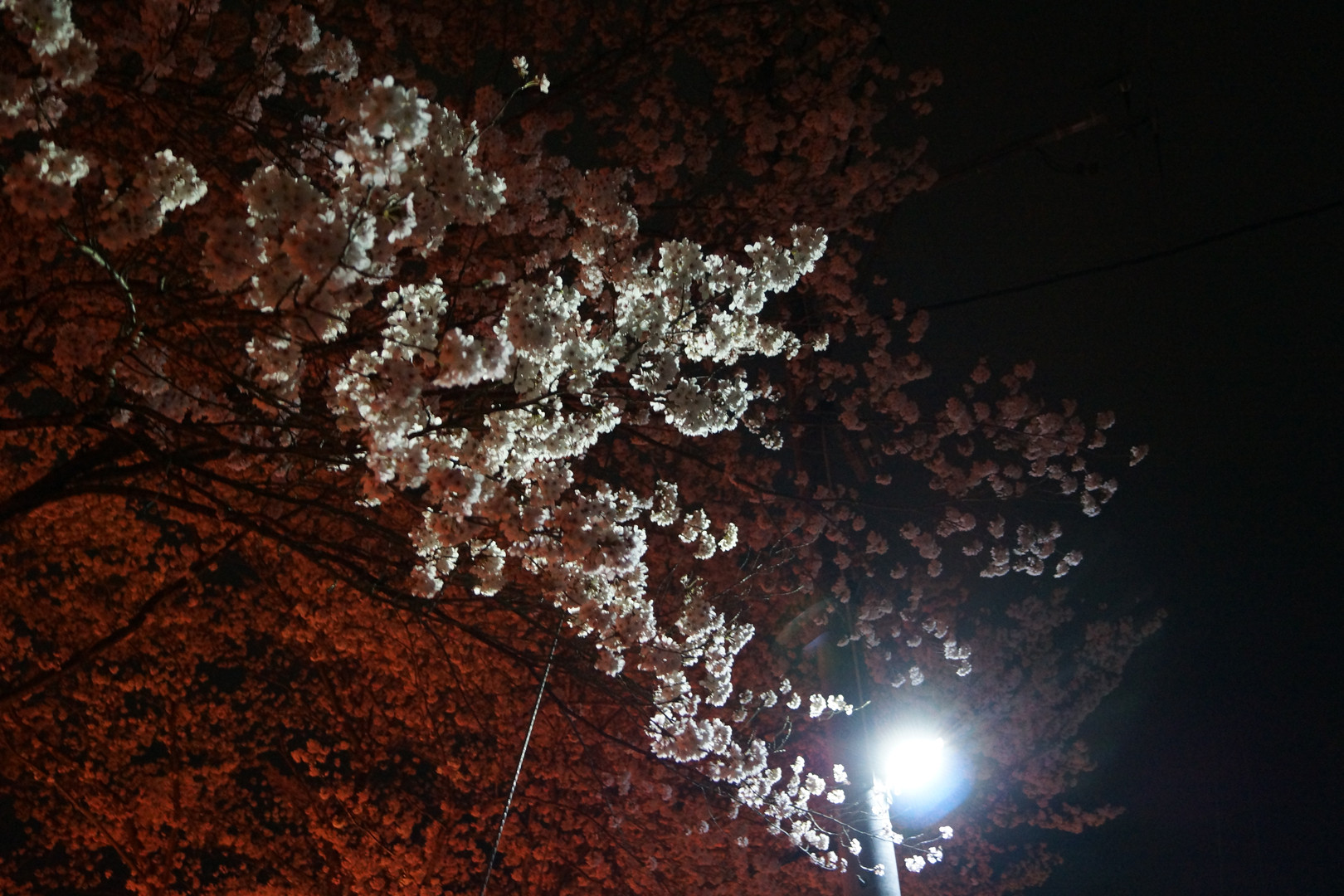 奥の提灯の灯りと、電柱の白色灯の灯りが、桜にキレイに映っていました。(^_^)