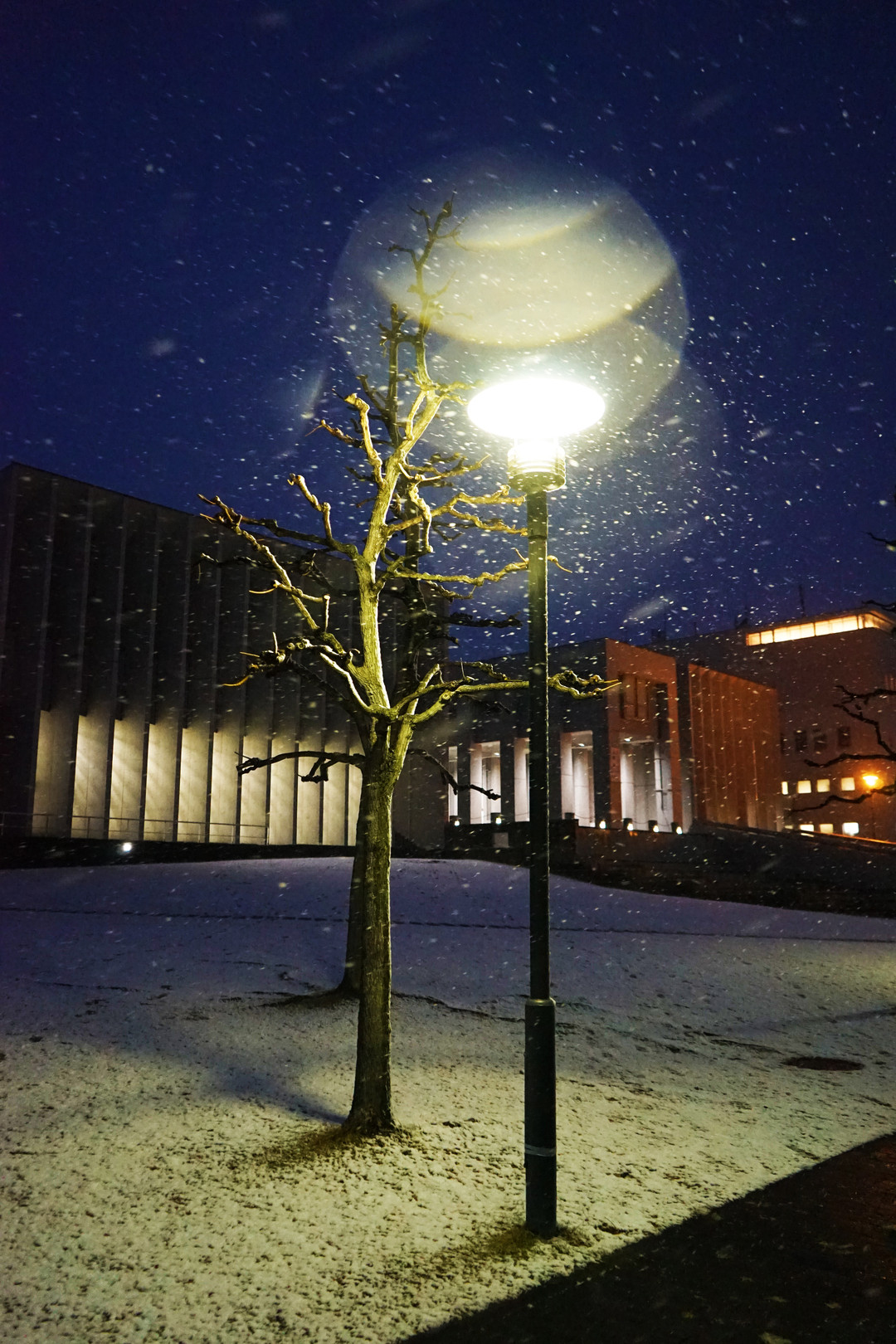 偶々レンズについてしまった雪が光を面白くしている、 ストロボを持っていませんので、街灯の力をお借りしました。