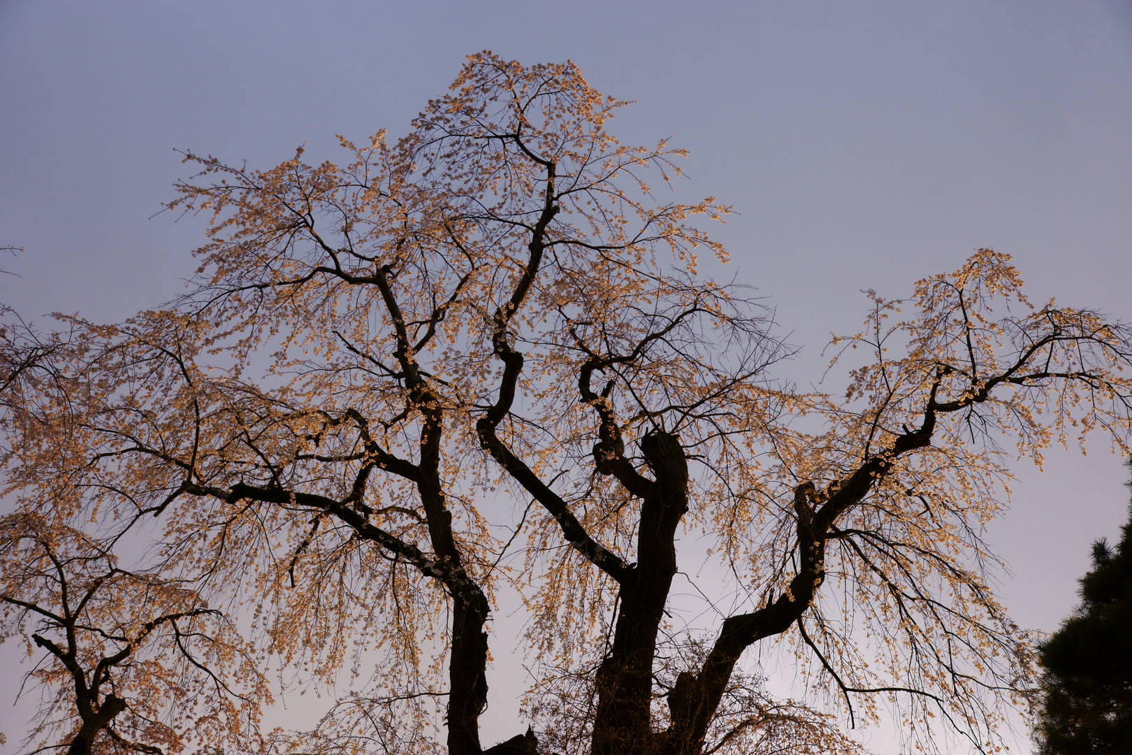 夕暮れの枝垂れ桜。落ちかけの夕日の当たり方がよかった。