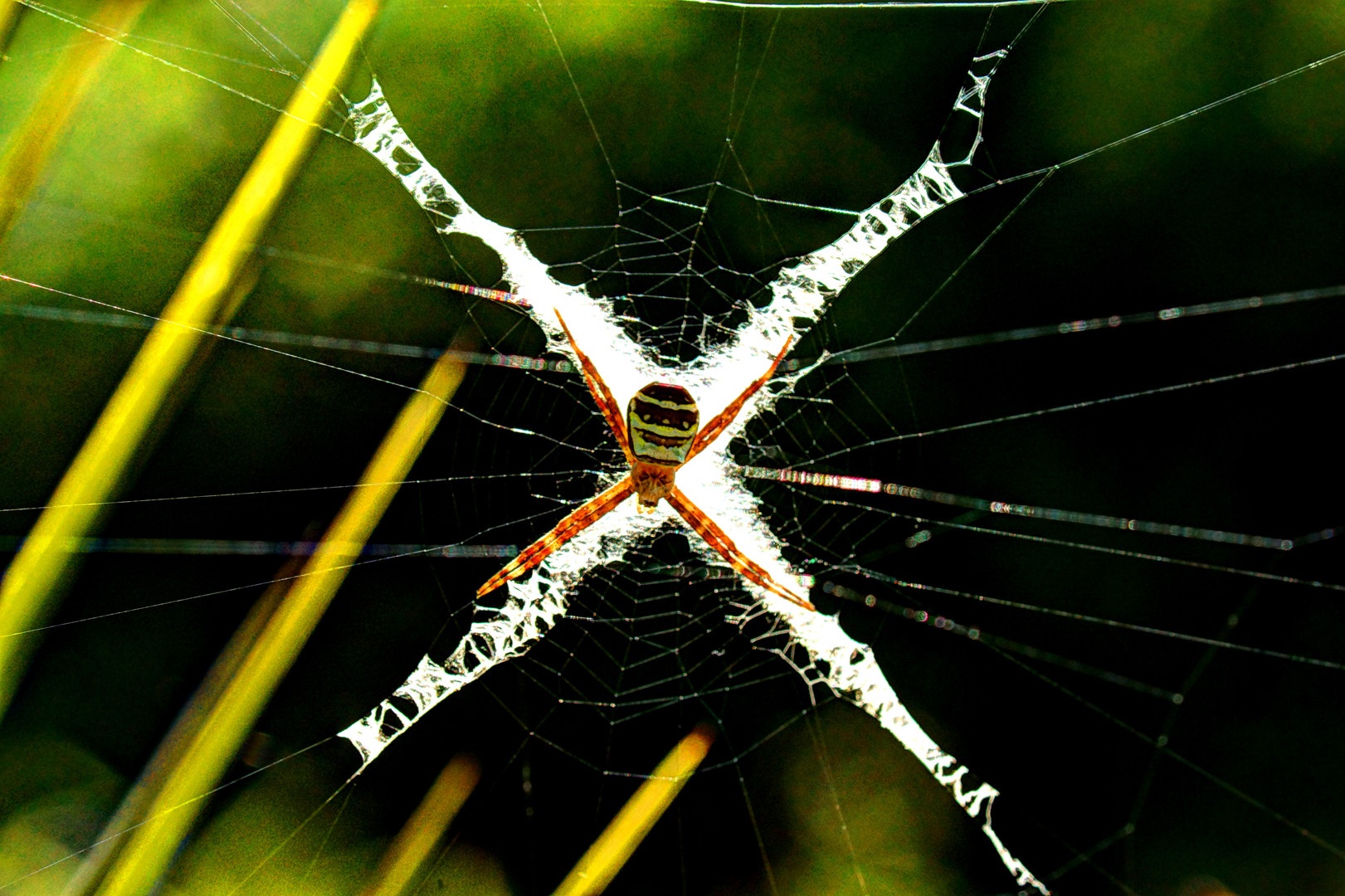 フェニックスに張ったクモの巣が朝日に輝いていました