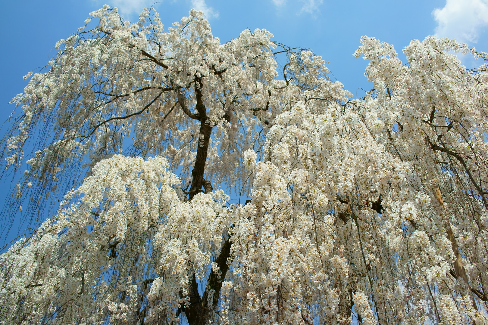 奈良県にある大野寺の枝垂れ桜です。 純白の花が空から降るような見事な晴れ姿でした。