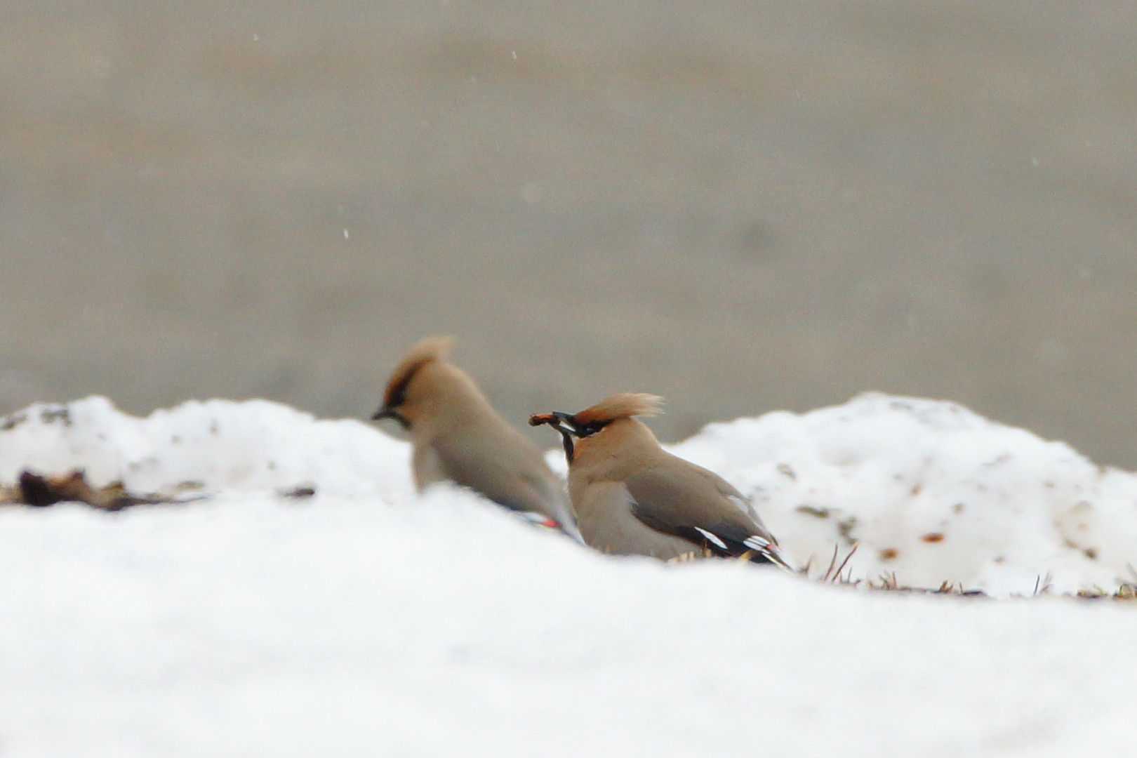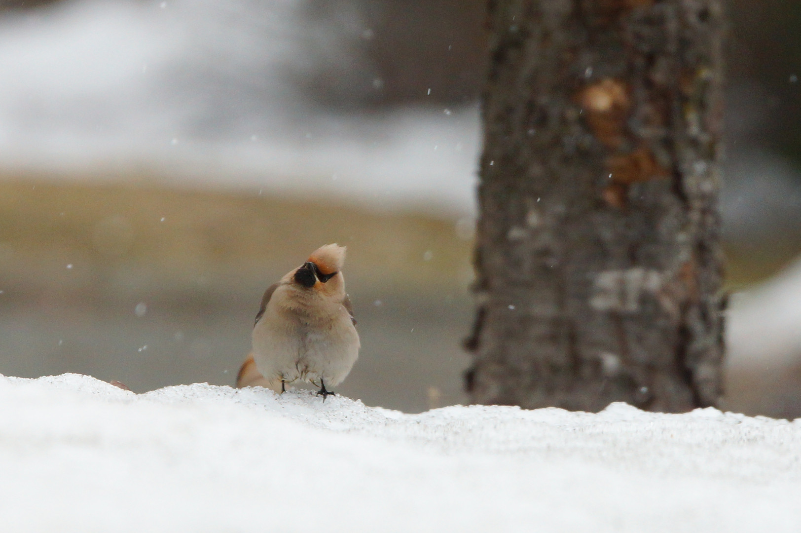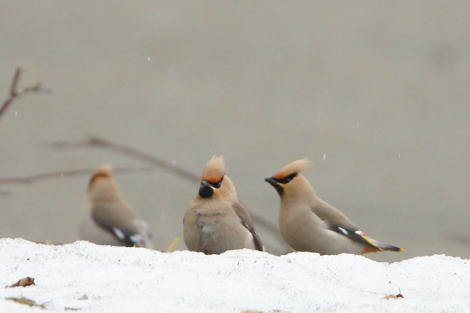 雪降る昼下がり 食事中のキレンジャク カメラを向けるな・・と 鋭い目でこちらを見ている ように思える