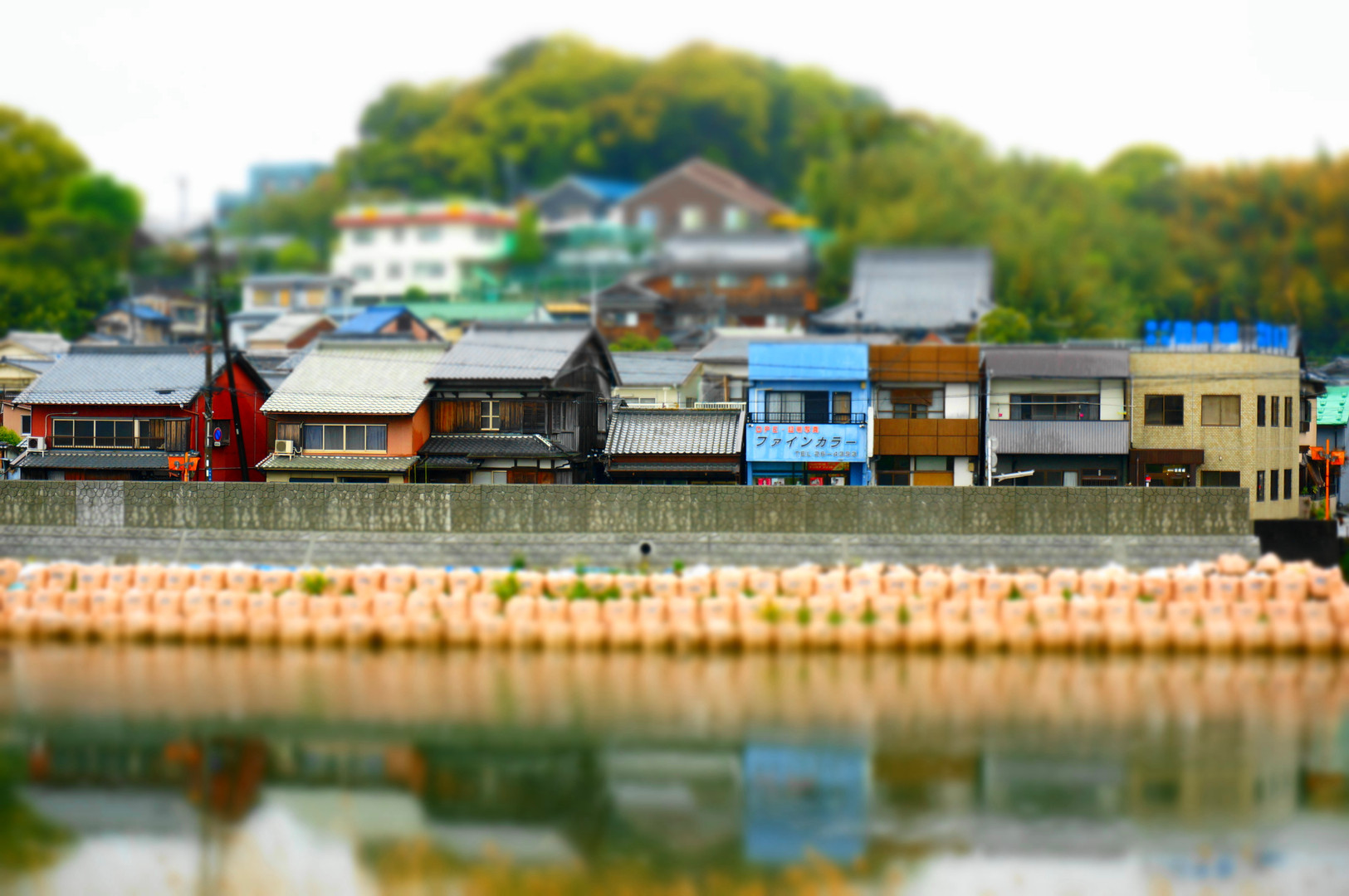 ここは水害の時には市内でも最初に水が来るであろう河口付近 護岸工事は終わったのでしょうか。 古い瓦屋根の家々に昭和を感じるお店が懐かしい風情を感じました 対岸の土手からミニチュアで撮ってみました~!