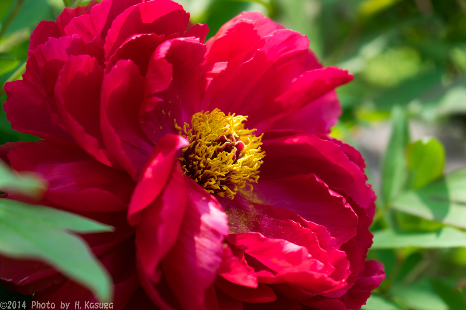 あまりに存在感のある牡丹でしたので、その存在感の元となる赤を強調するように撮影しました。 花の赤、葉の緑、花粉の黄。 3色のコントラストが力強さを感じさせてくれます。
