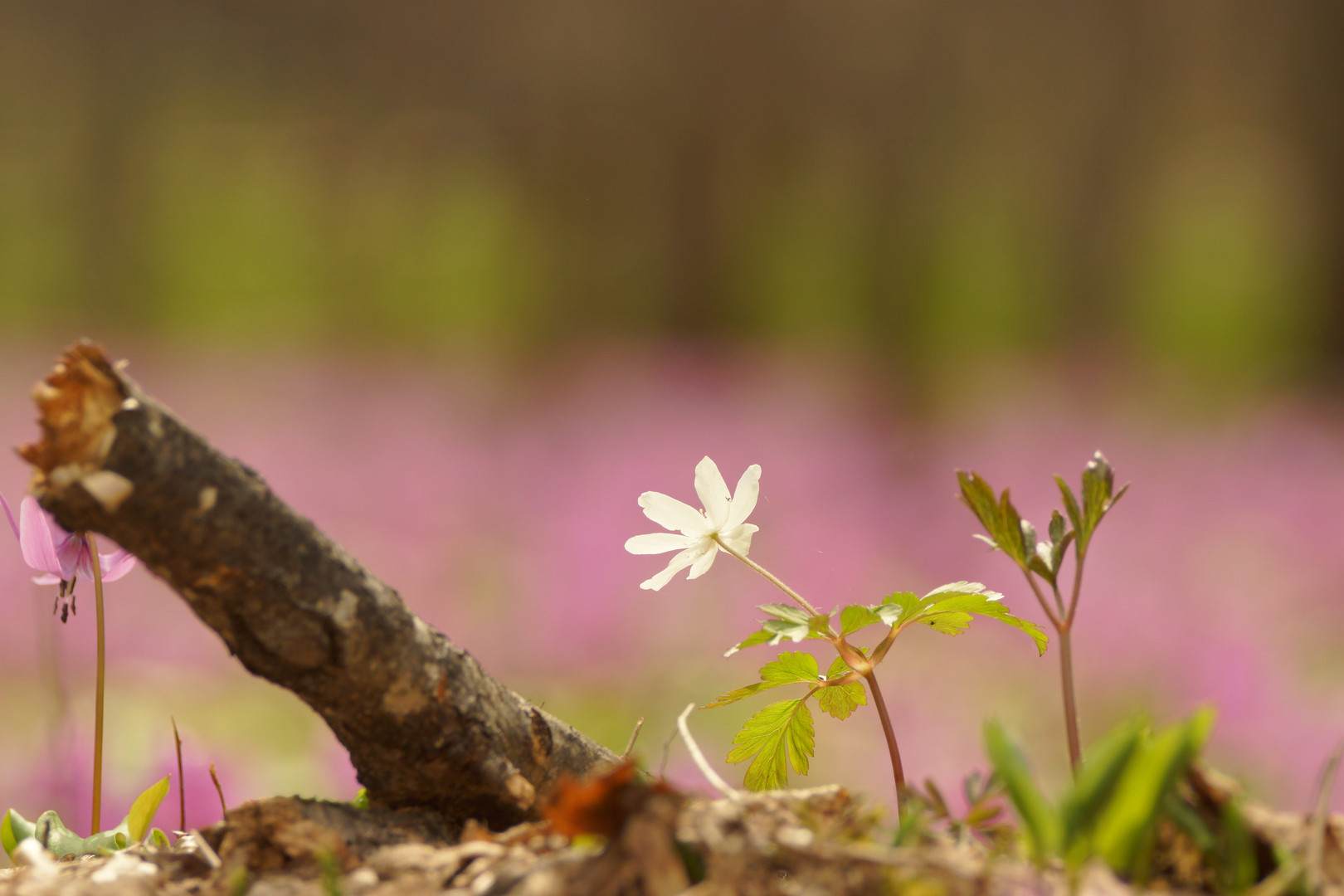 ピンクのお花に向かう? キクザキイチゲ