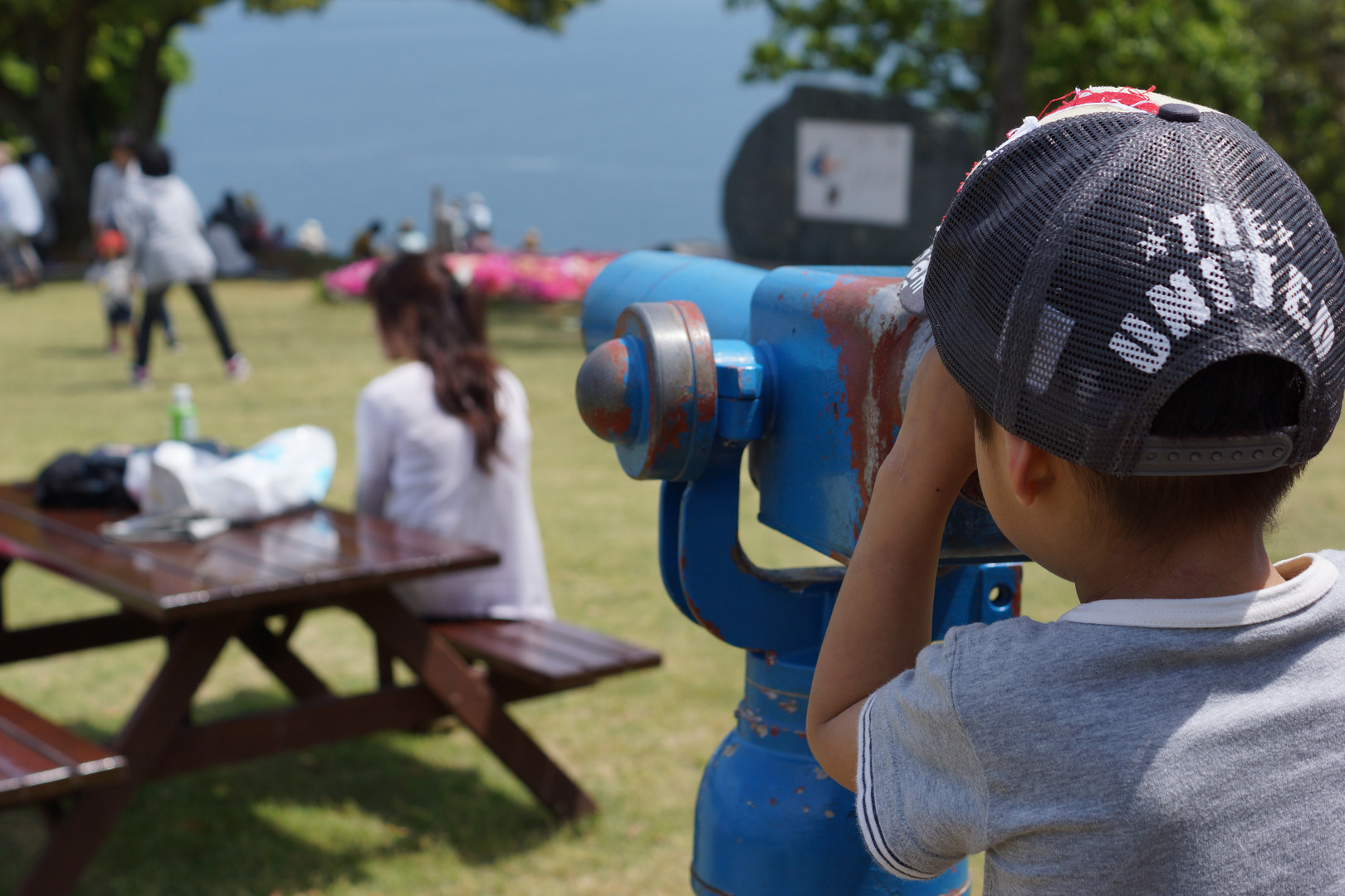 能古島(のこのしま)での一枚です。 次男が望遠鏡で何かを見てます。
