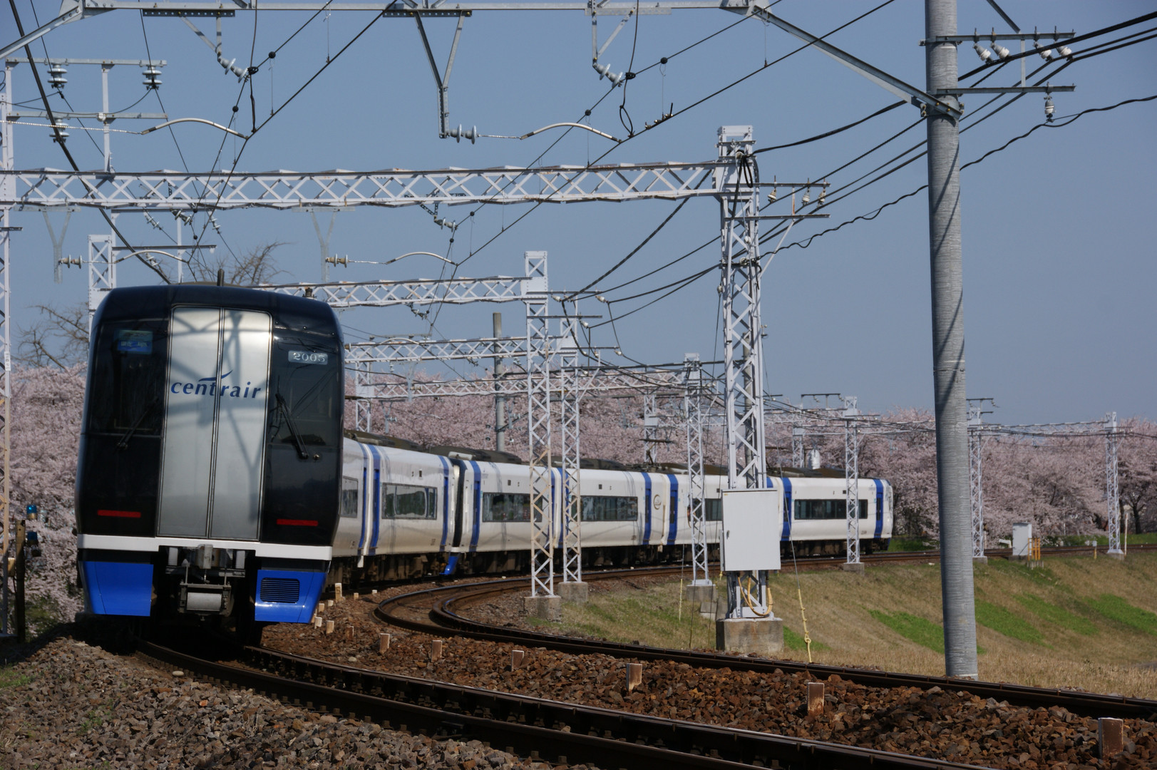 笠松町の堤防沿いの桜を背景に、名鉄ミュースカイを撮影しました。
