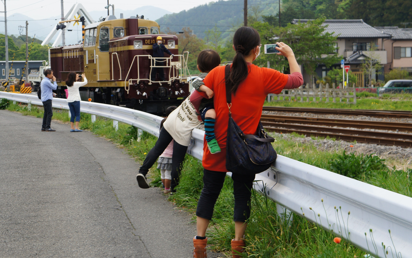 一日の仕事を終えたトロッコ列車の機関車は、客車から切り離された後、足尾方面の車両の先頭に付け替え作業を行います。その作業を見ていた人たちは、夢中でシャッターを切っていました。もちろん、私も^^;