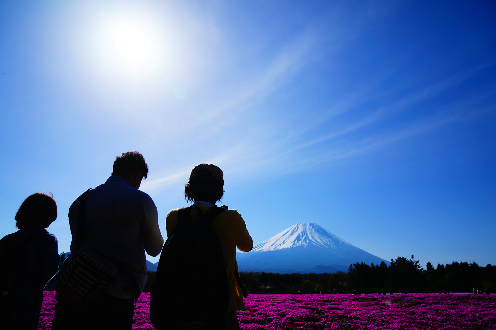 富士芝桜祭りにて。 奥様と友人2人が芝桜と富士山に夢中な姿です。