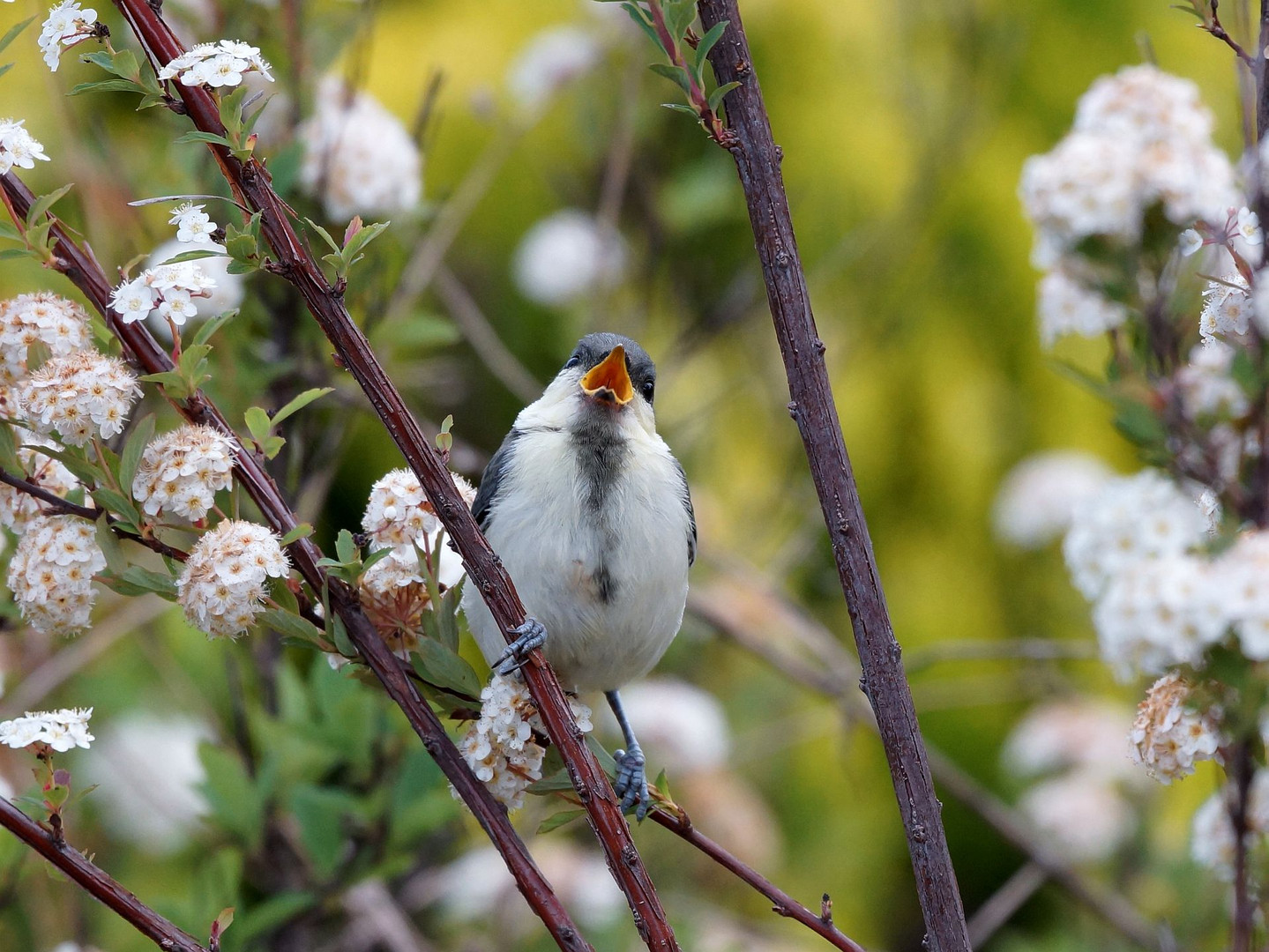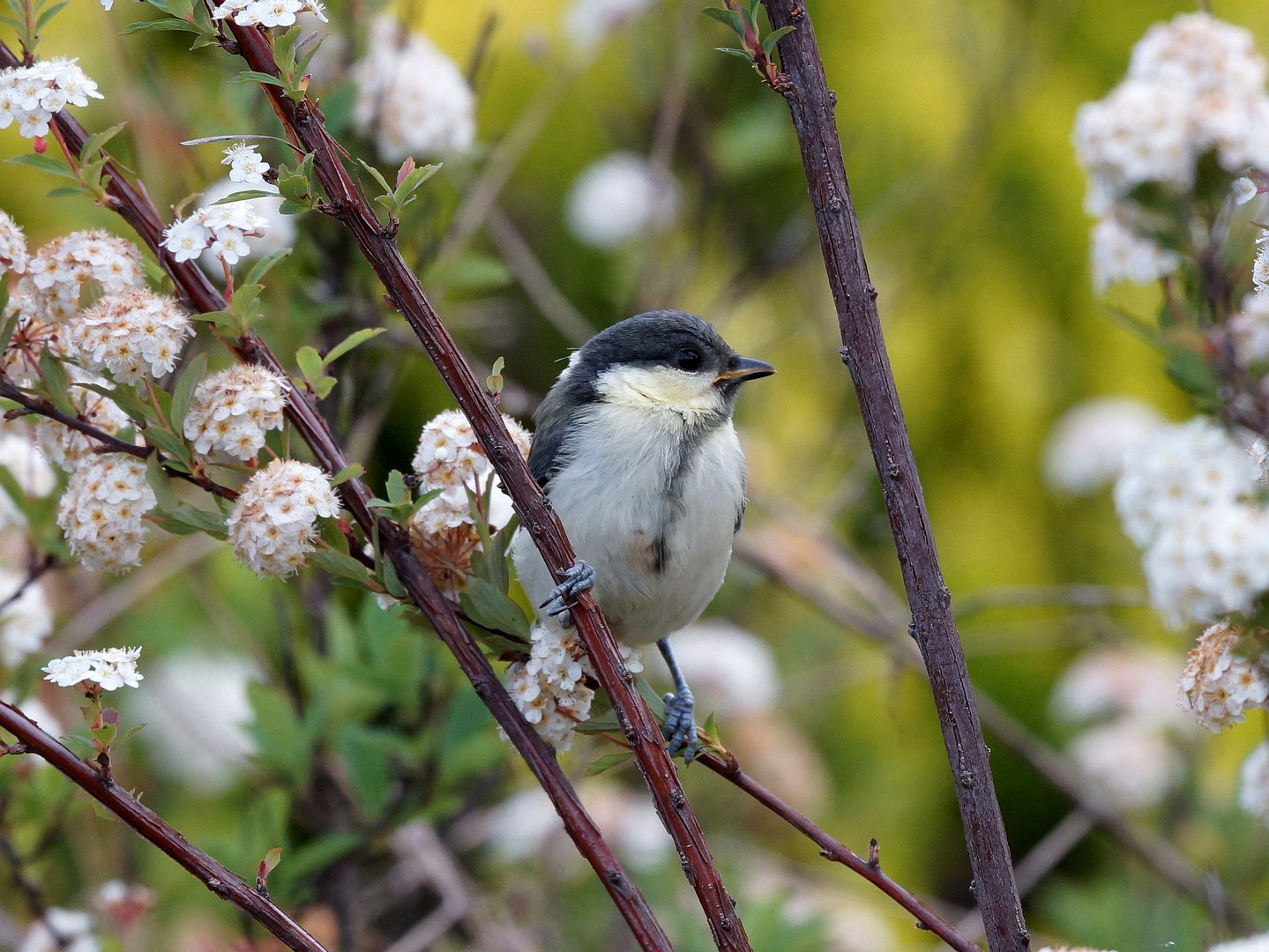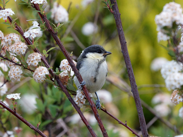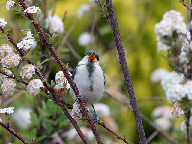 近所の公園でシジュウカラの幼鳥に出会いました。 目の前の花のある枝にとまってくれました。ラッキー 幼鳥ってなんでこんなに可愛いんだろ? 良く見ると器用なとまりかたしているなぁ