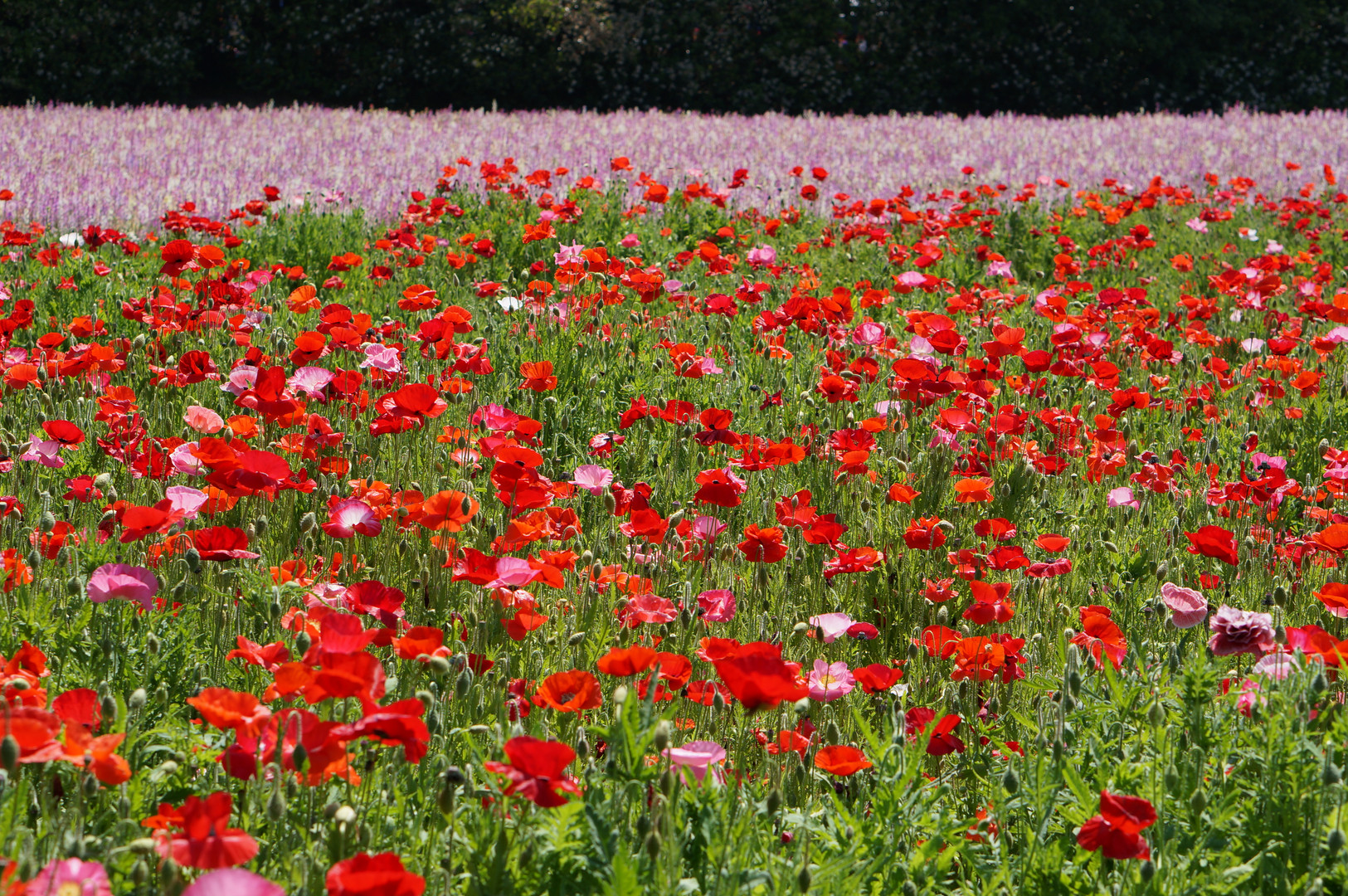 手前に咲く赤い花が「シャーレーポピー」、その奥に咲くピンクの花が「リナリア」。