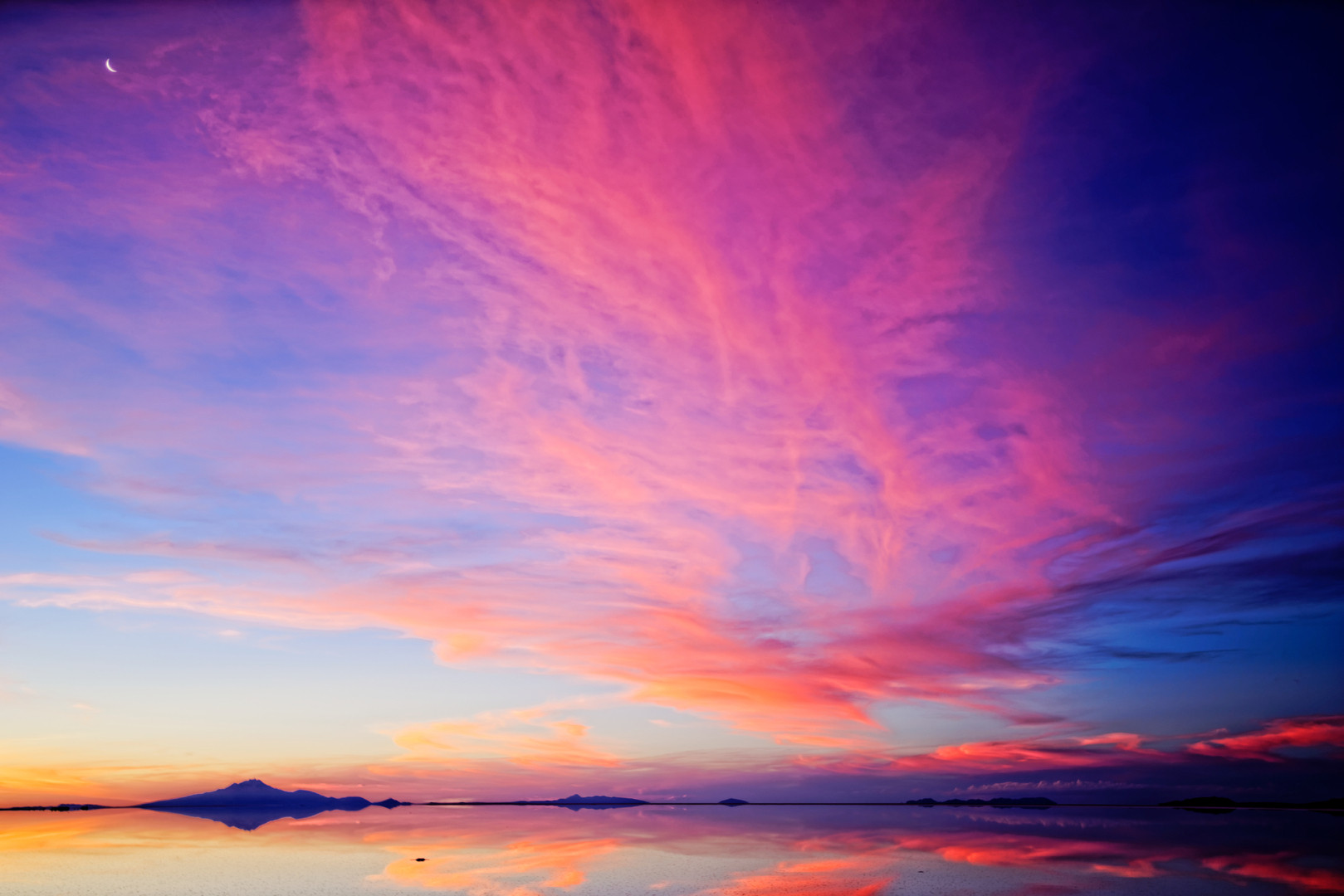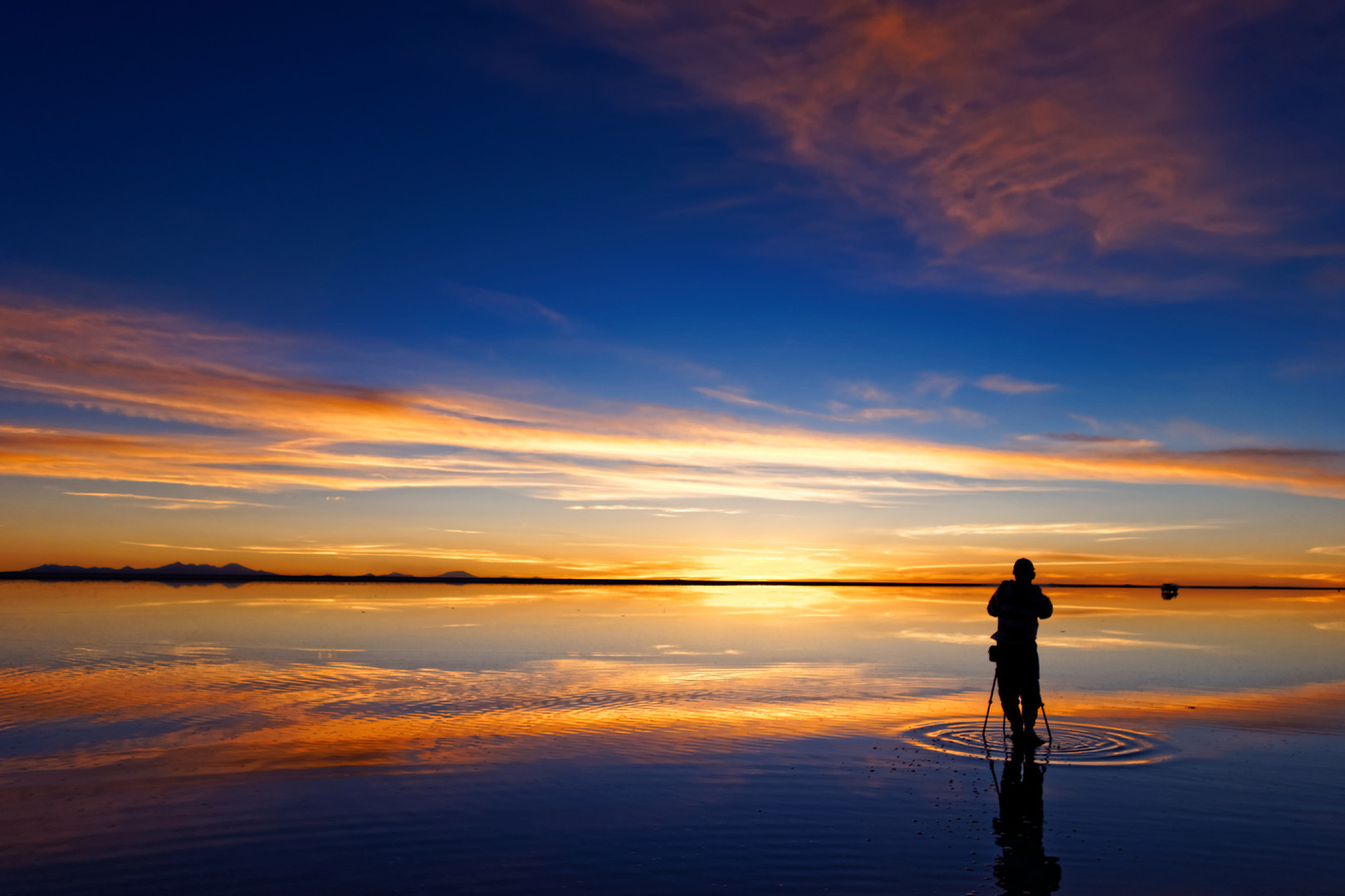 ウユニ塩湖で燃えるような夕暮れに思わず見とれてしまいました。