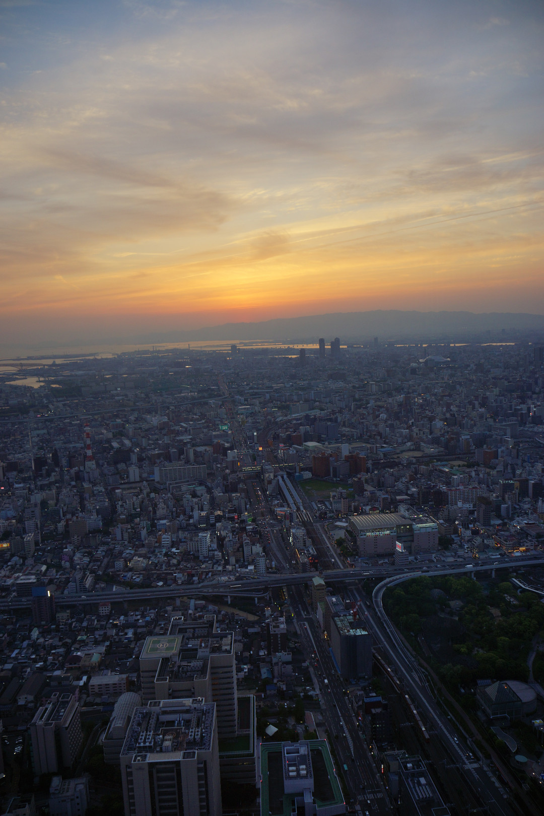 あべのハルカスの展望台から見た夕暮れです。 遠くの山間に見える夕日と暮れて行く都会のコントラストが、不思議な雰囲気を与えてくれます。