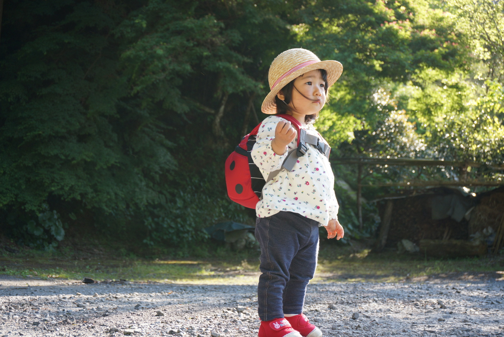 GWに熊本県水俣市の嫁さんの実家近くの神社にて。 お気に入りのてんとう虫のバッグを持って散歩。 娘は1才5カ月です。