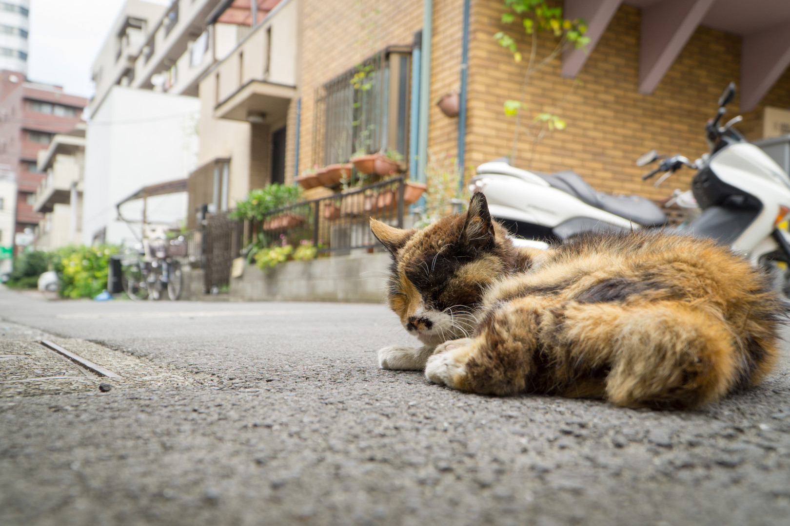 街角で無防備すぎる猫ちゃん。 車には気をつけてね。