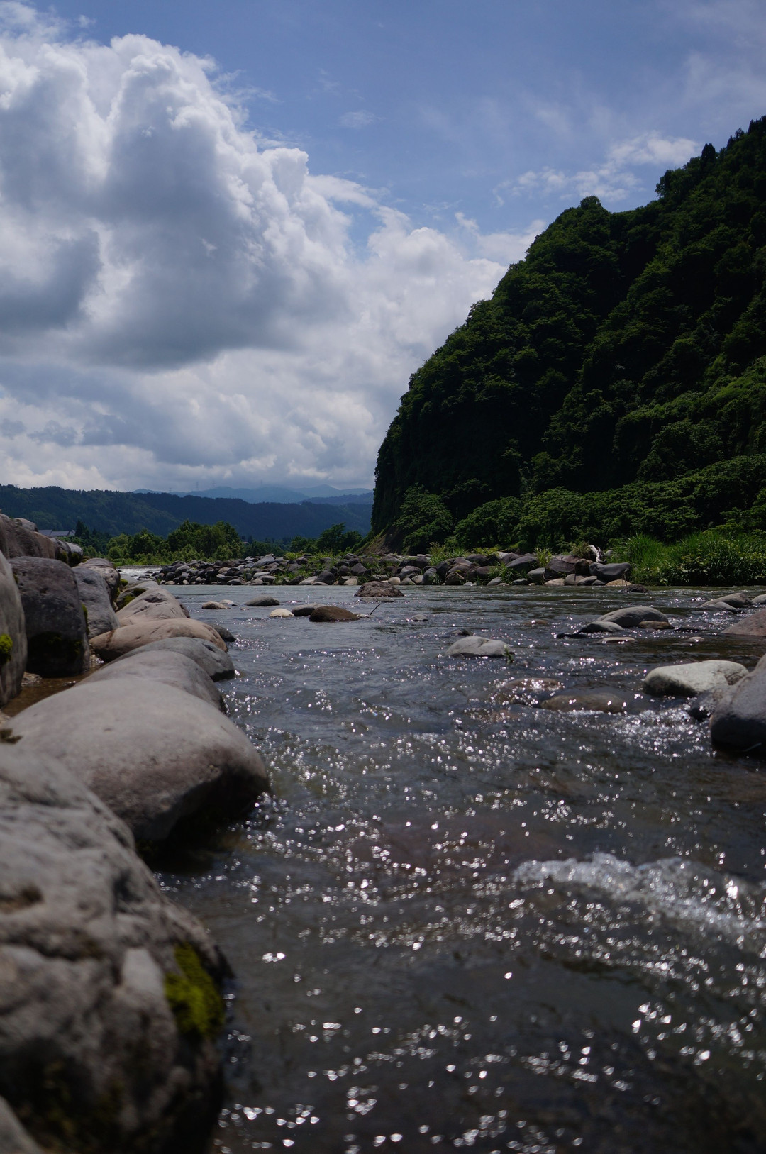 新潟県の津南町を流れている中津川です。 右側に見える高台にはひまわり畑があります。