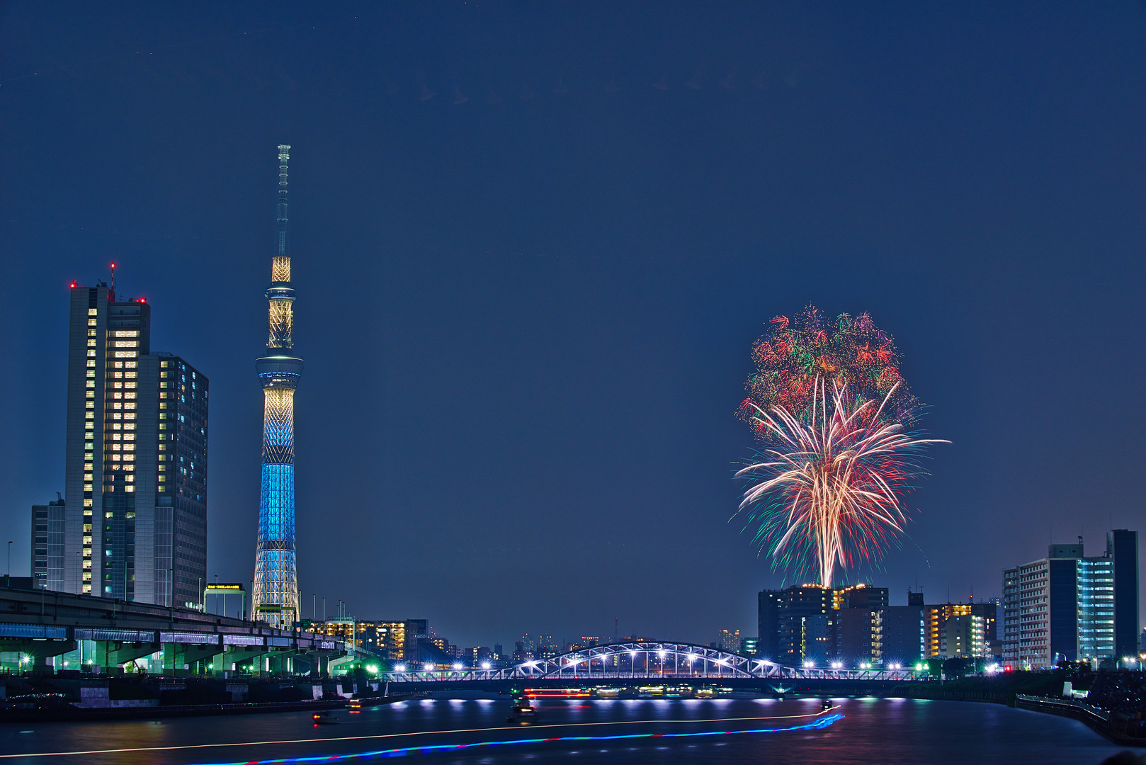 隅田川花火大会です。 午後2時過ぎに現地に着いたら、空いている場所は皆無でしたが、何とか、狙っていた辺りのポイントで隙間に入り込む事ができました。(^^; 今回は花火の大きさが限定されていて、玉数が多いので、花火が重なってしまうことを想定してND8を使用してみました。