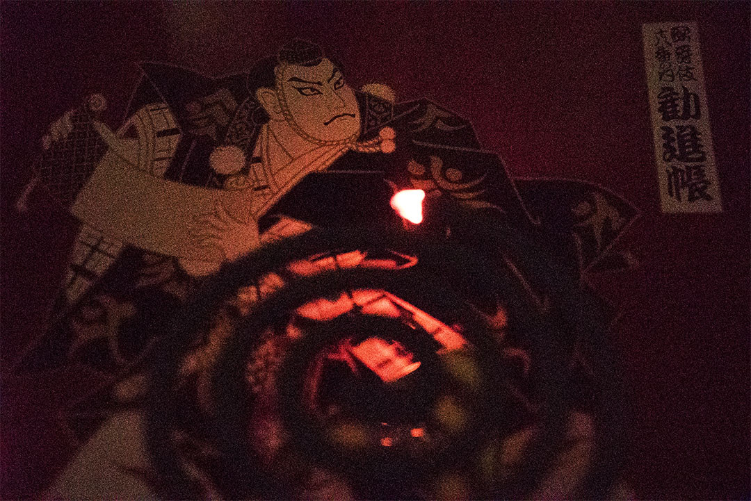 お盆の上に乗せた蚊取り線香です。線香の火だけでお盆の柄を撮影しました。 肉眼では真っ暗闇に赤い火だけが薄っすらと見えるだけです。しかし、このカメラはリアルタイムで液晶モニターに柄の映像を表示できます。しかも火ではなく柄にピントが合います。凄い時代になりました。