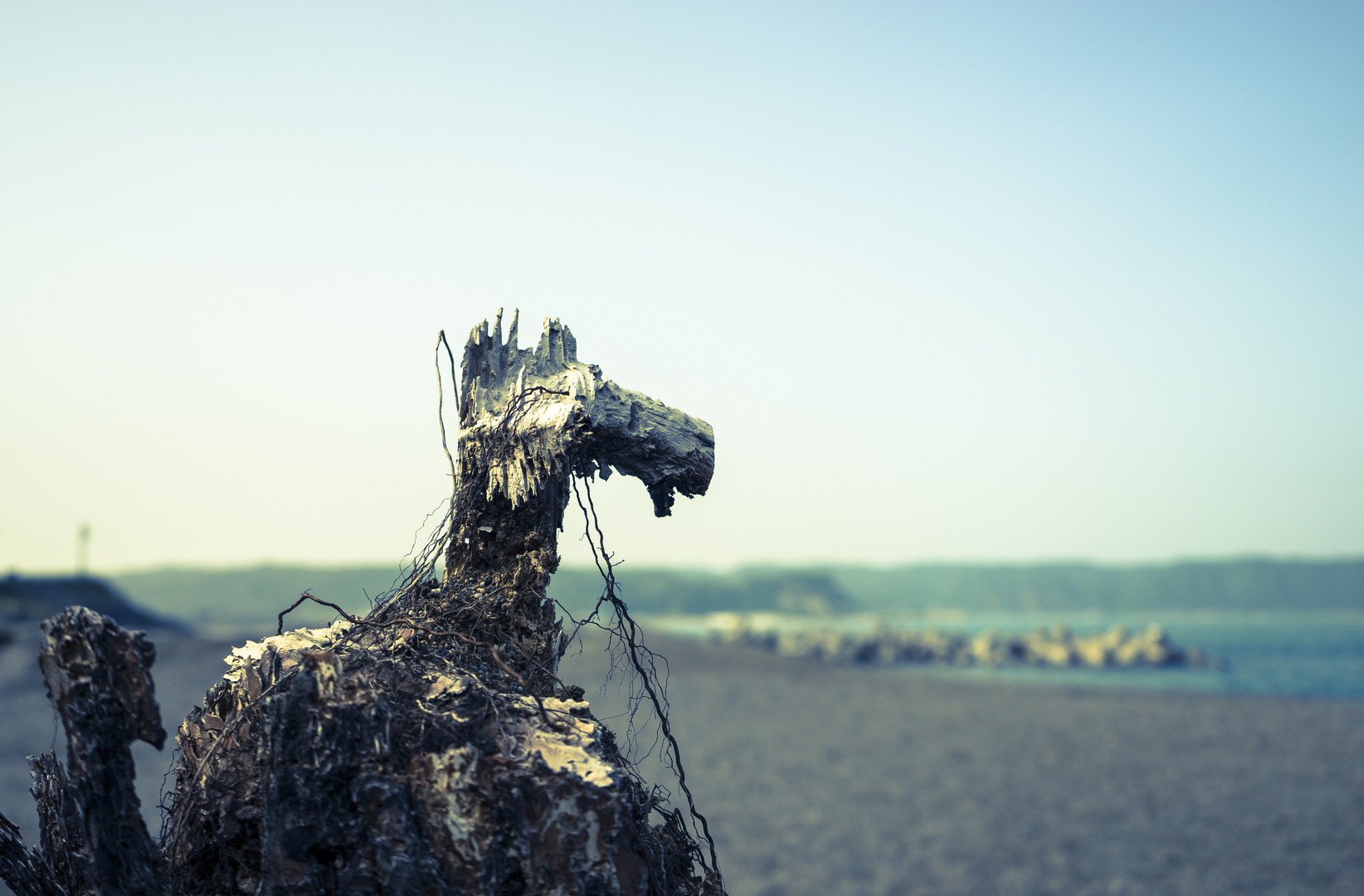 砂浜で朽ち果てた木が、ずっと海を眺め続ける馬のようであった。