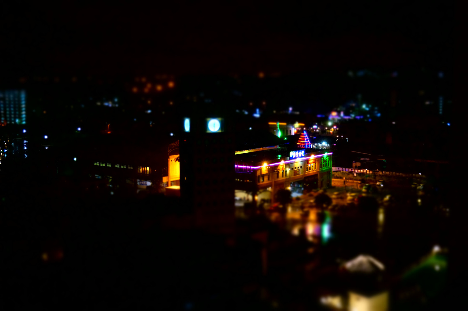ピクチャーエフェクト+のミニチュアを使い夜景を撮りました。 フォーカスは横向き中央にかけました。 うまくミニチュア風になりました。