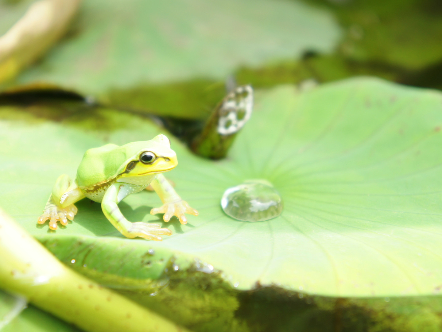 マクロレンズでじっくり撮影しました。 カエルとしずく、どちらを主役にすべきか・・・悩んだ挙句。 カエル目線で。。。