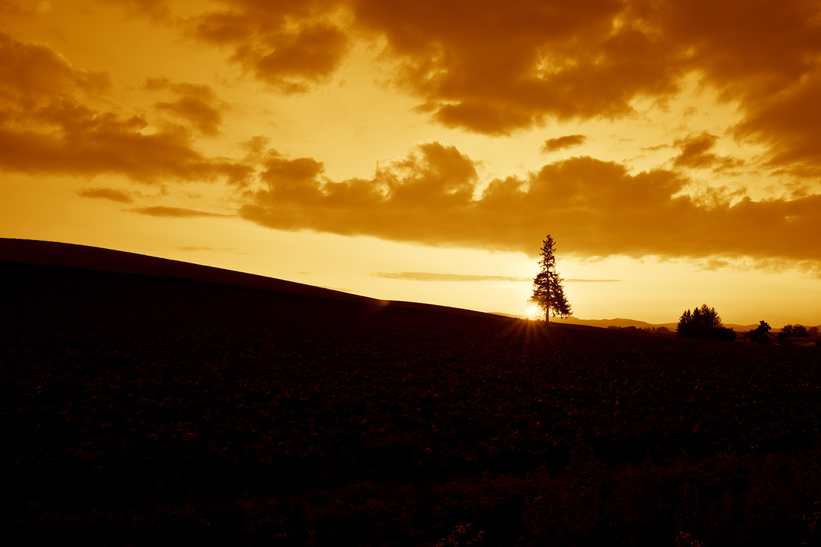 これも有名な美瑛の丘シリーズで クリスマスツリーです。 青い池のあとにダッシュで向かい 何とか日没を撮影できました。