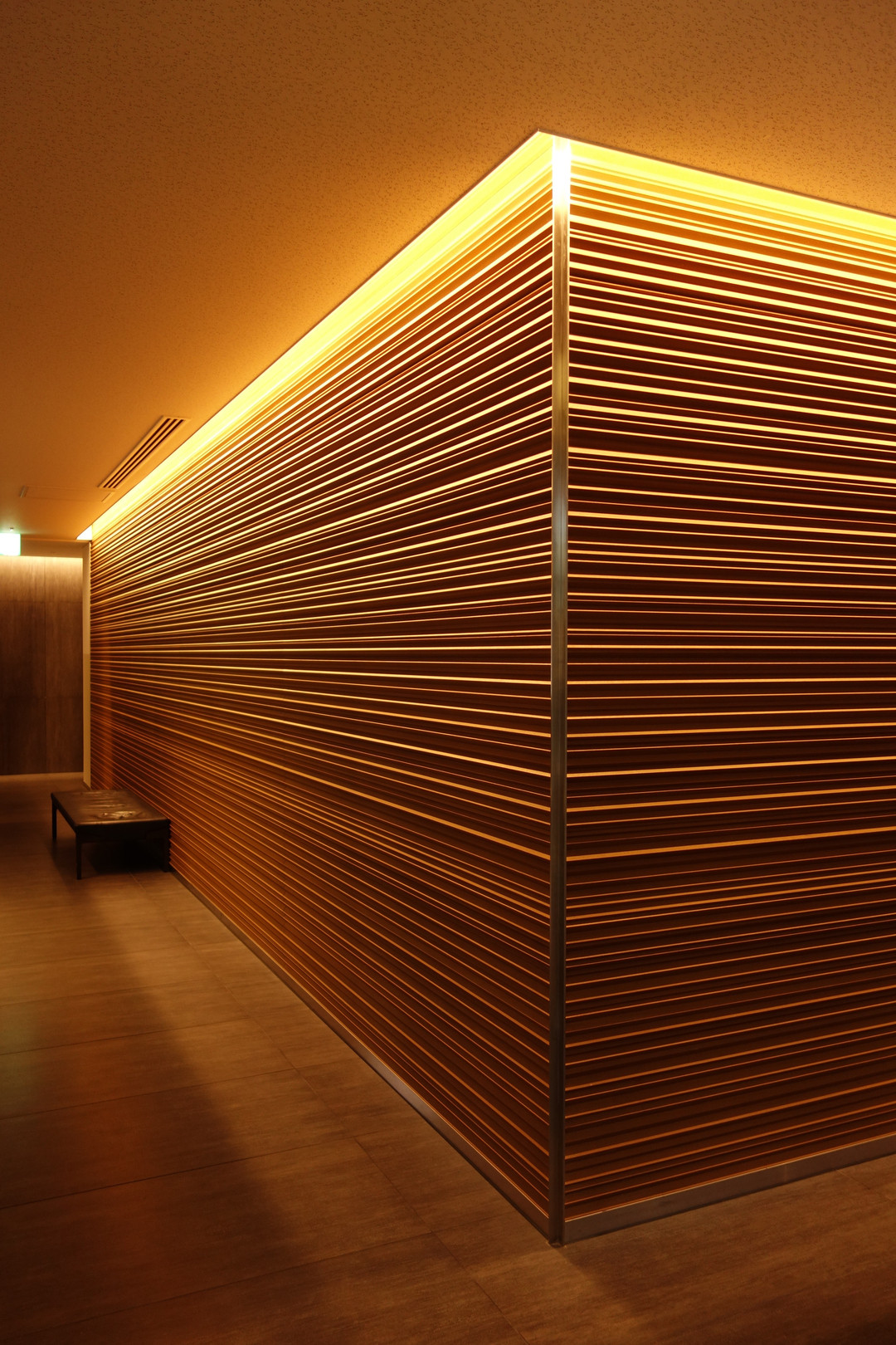 明かりは上だけで、組み合わせた木の凹凸で明暗を出している。 いい仕事してますねェ。