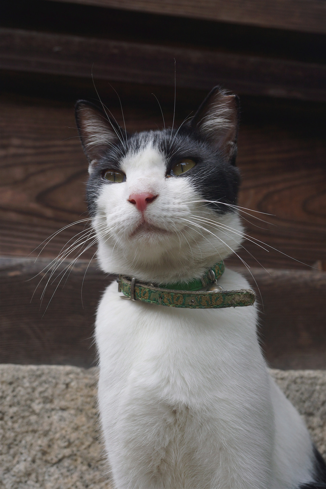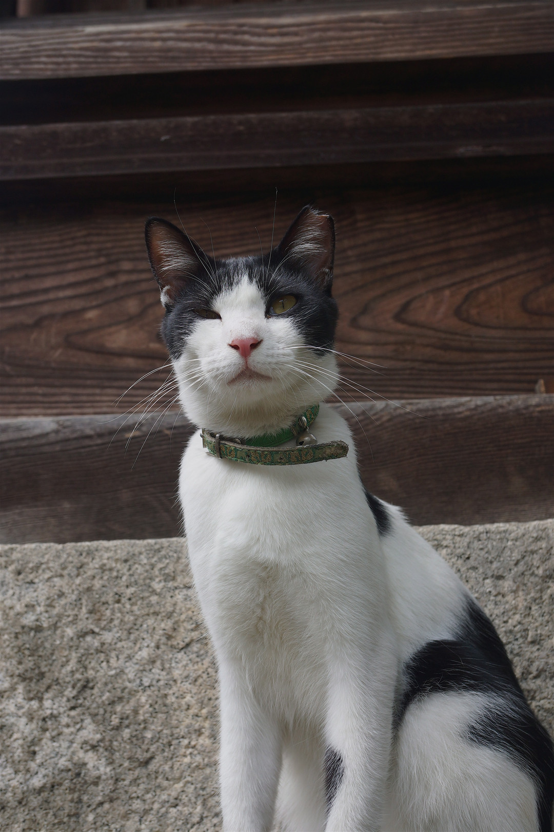 尾道ロープウェイ発着場のすぐ真下にある祠で、スリムな白黒猫ちゃんに出会いました。性格は温厚で、頭も撫でさせてもらえました。飼い猫らしく首には年季の入った緑の首輪をしていました。
