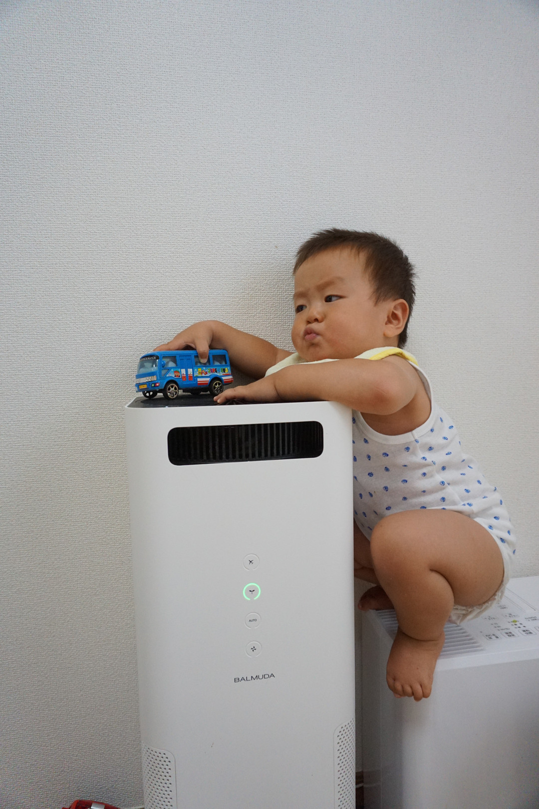 ハイハイしかできないのに、加湿器に登って更に隣の空気清浄器の上で車を走らせていました(>_<) 危ない!と注意したことろこの口尖がらせのふてくされ顔!(*^_^*) おもわず笑っちゃいました!