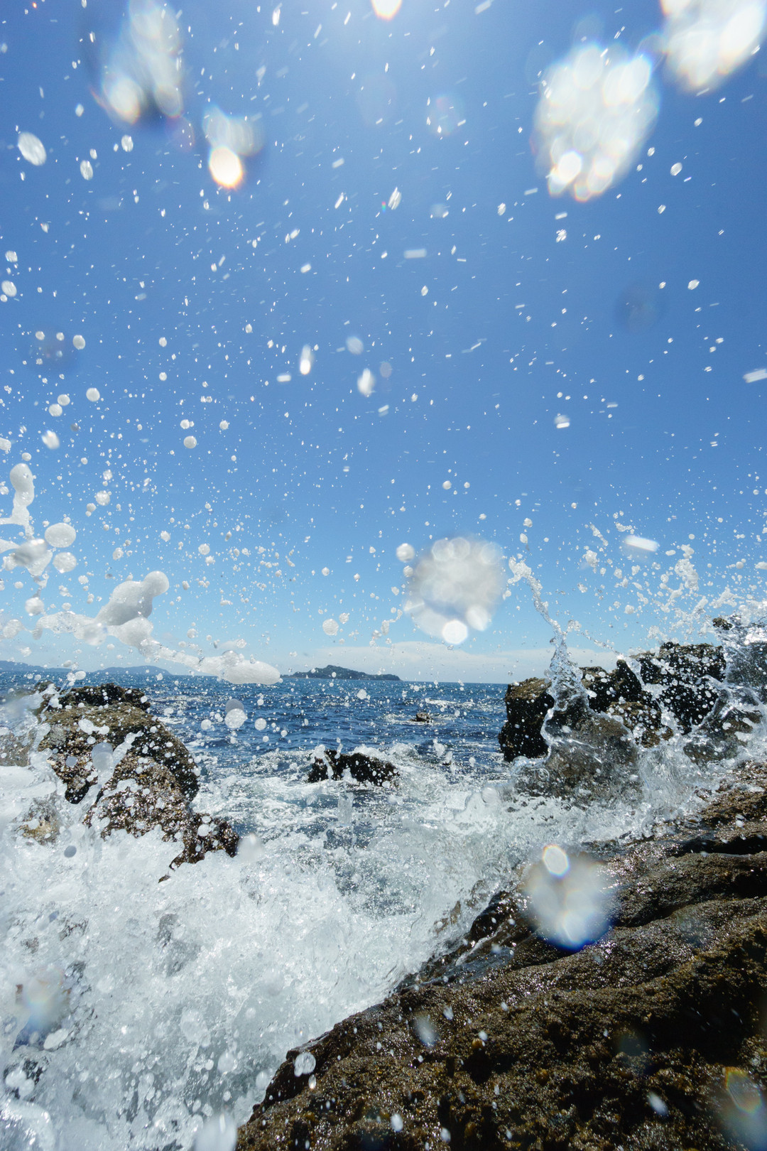しぶきがかかるギリギリまで寄って撮った波しぶきです。 これの撮影後プロテクターに水滴が付いたのでこれ以上寄るのはやめました。