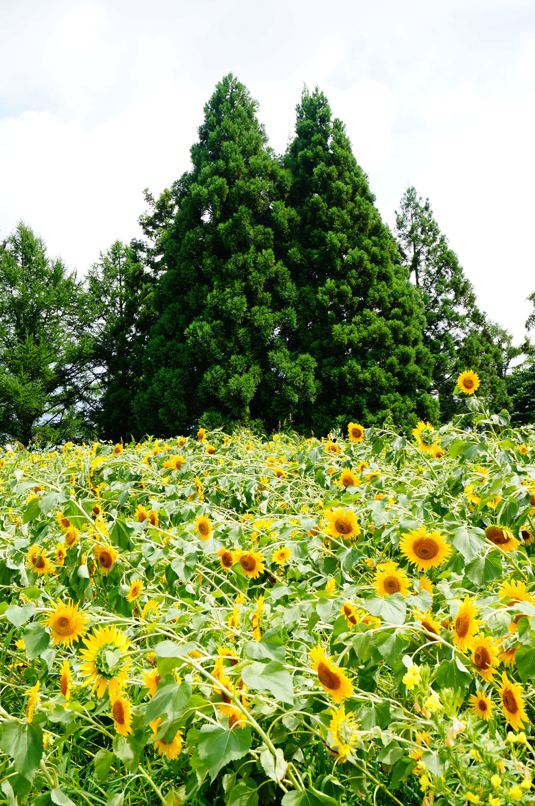 台風後にひまわり畑にいったらこんなことに(´Д⊂ヽ 後ろの木がトトロっぽいです☆