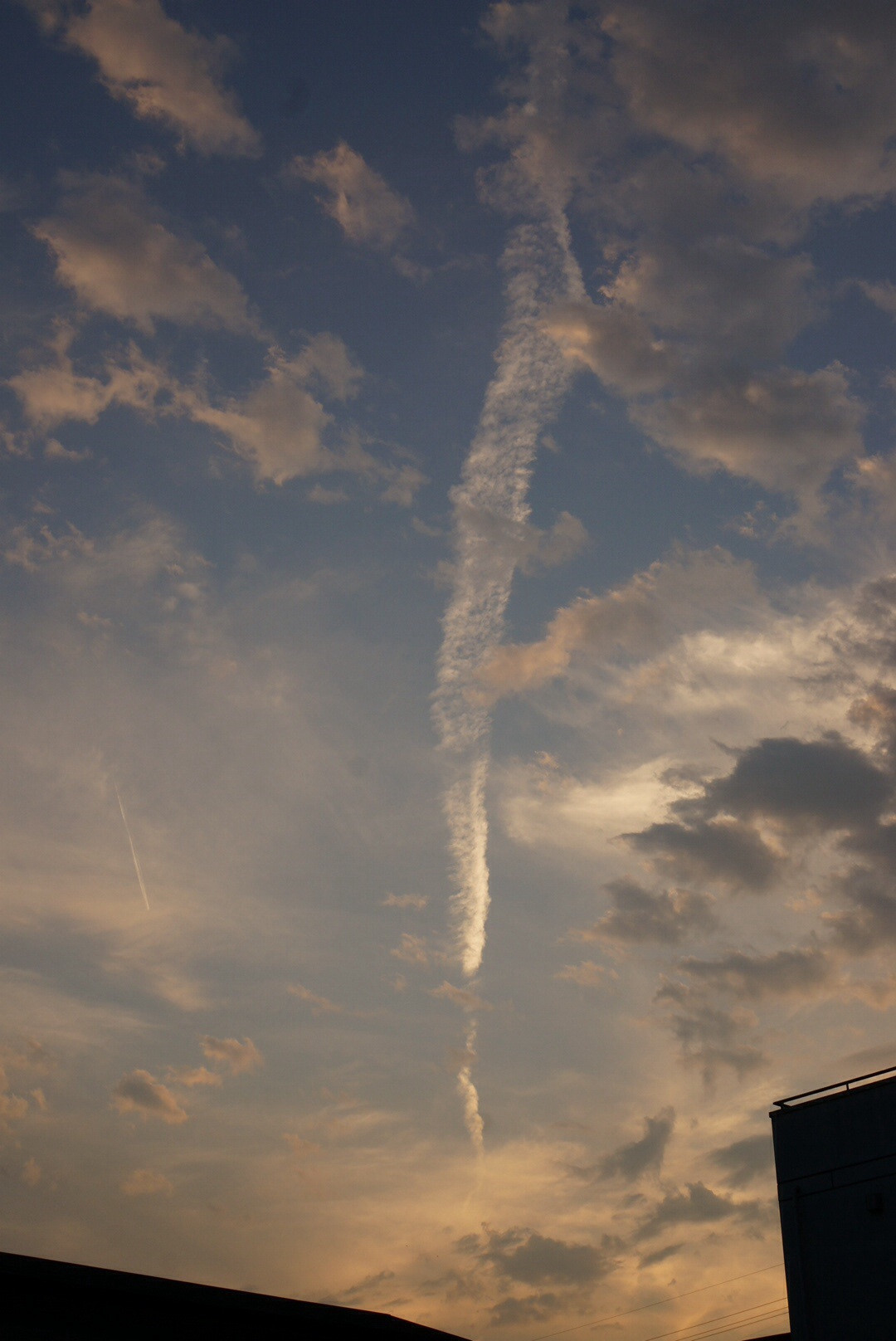 夕方に散歩がてら外に出たら空がとても綺麗で、たくさんの飛行機雲が浮かんでました。青とオレンジの混ざる空が好き。