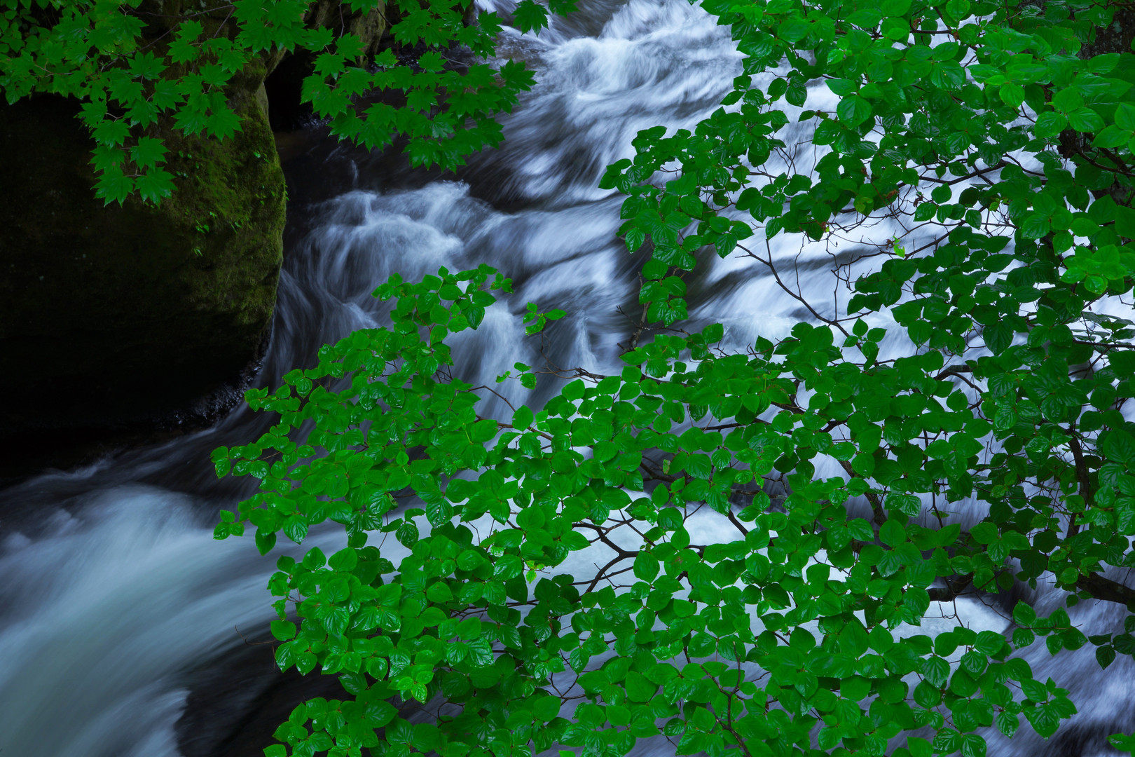 雨上がりの新緑。渓流を背景に手前のヤシオつつじ、対岸のモミジを対比して狙ってみた。