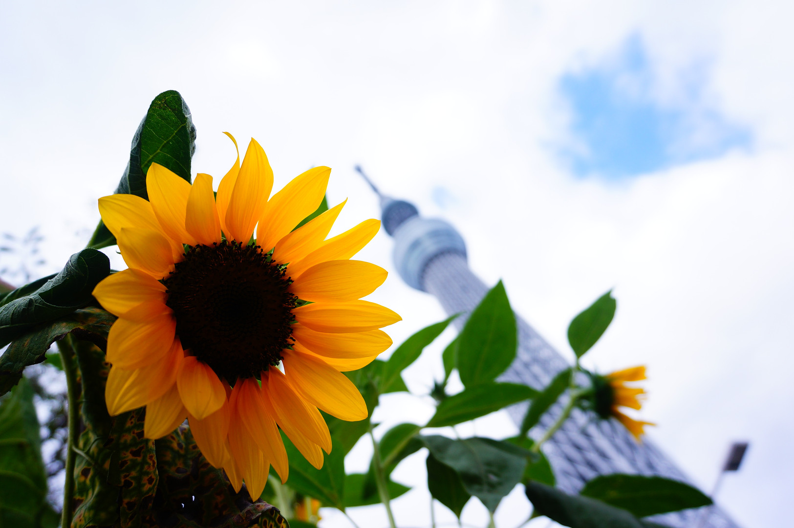夏の終わり、かなりうつむき気味の向日葵でしたが、ローアングルからスカイツリーと一緒に撮ってみました。