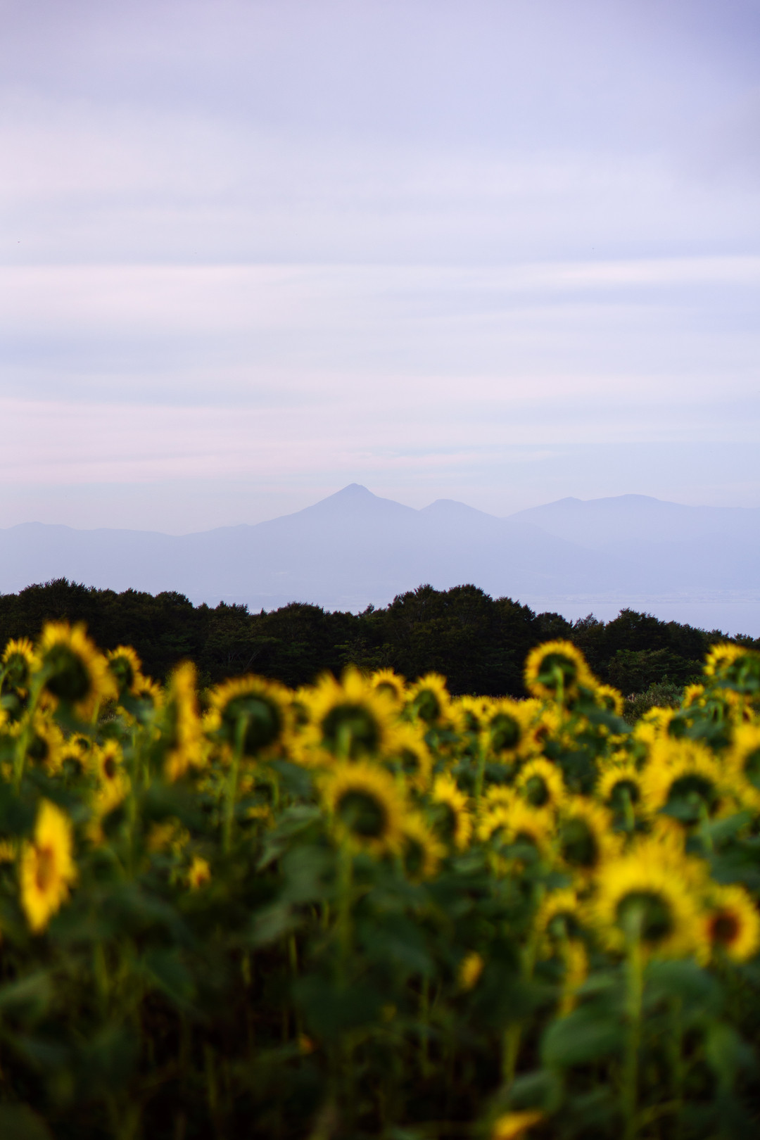 遠くに磐梯山が見えるところにヒマワリがすべて向いているのがちょっとよかったので撮影してみました。