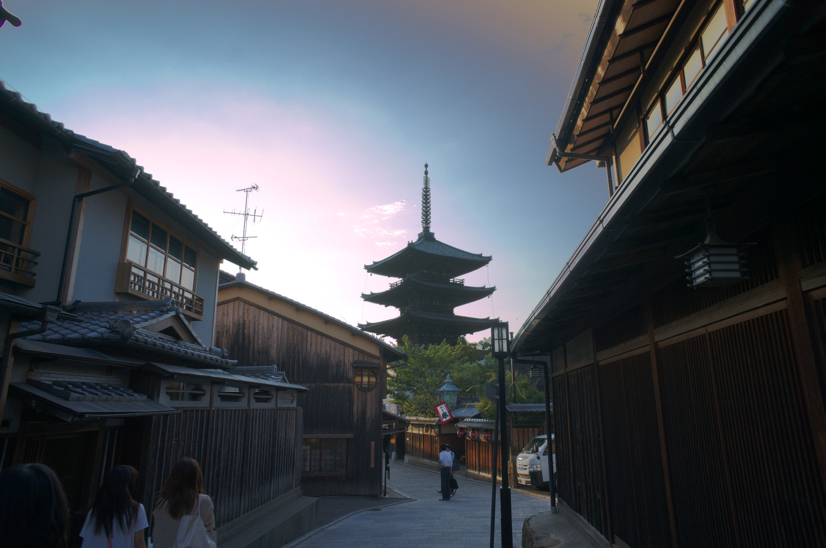 清水寺から八坂神社への道中に撮ってみました。 夕方だったので空のグラデーションが分かるようにしてみました。