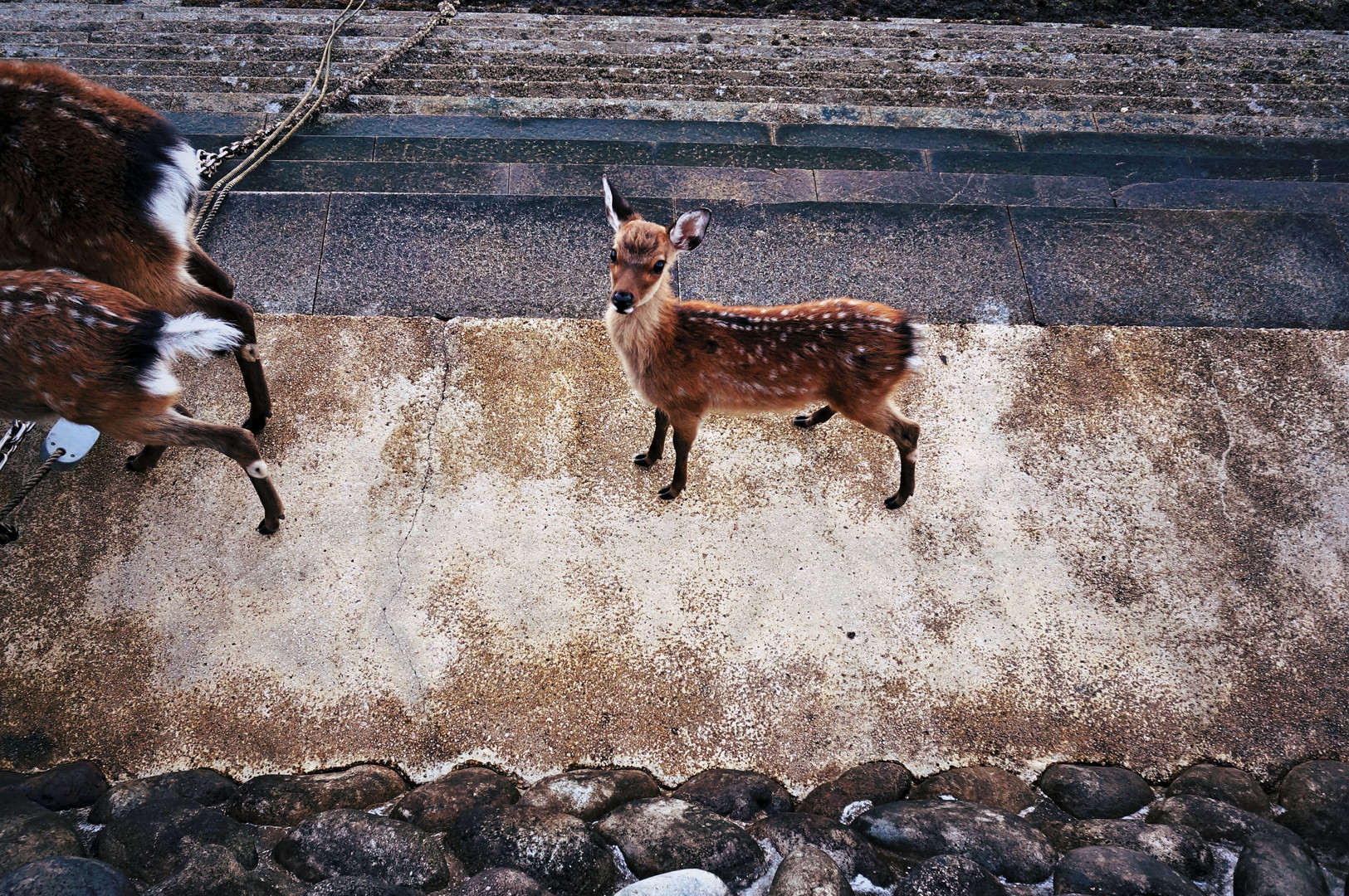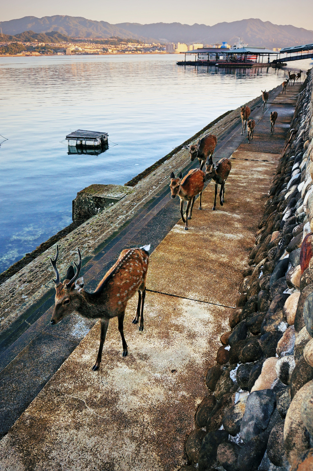 宮島に泊まったら早朝にシカの行列が見られました。