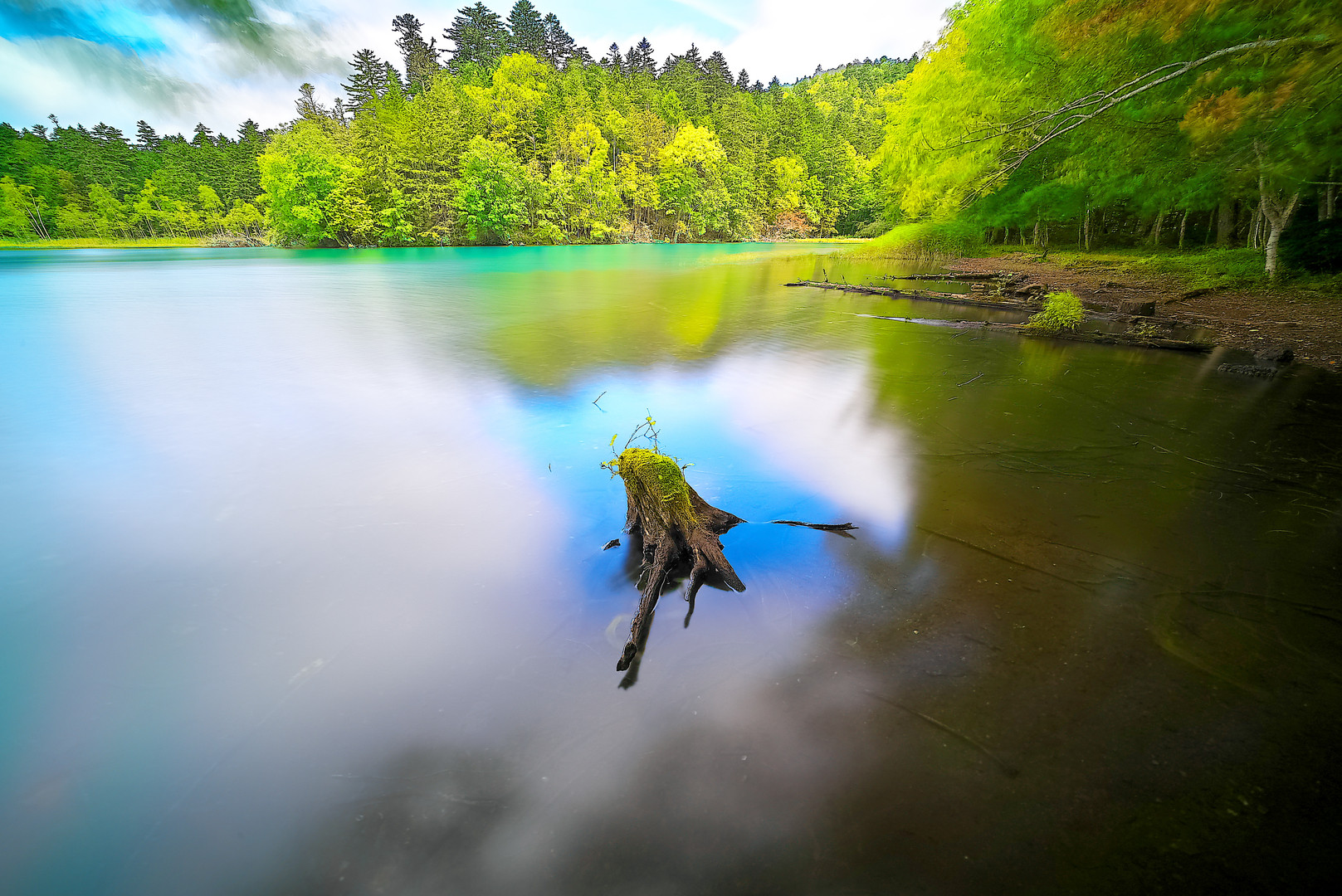 2014/9/15 オンネトーにて α7S + ULTRA WIDE HELIAR 12mm F5.6 Aspherical II 雲の切れ間の青空に切り株がすっぽりとはまって?いました。