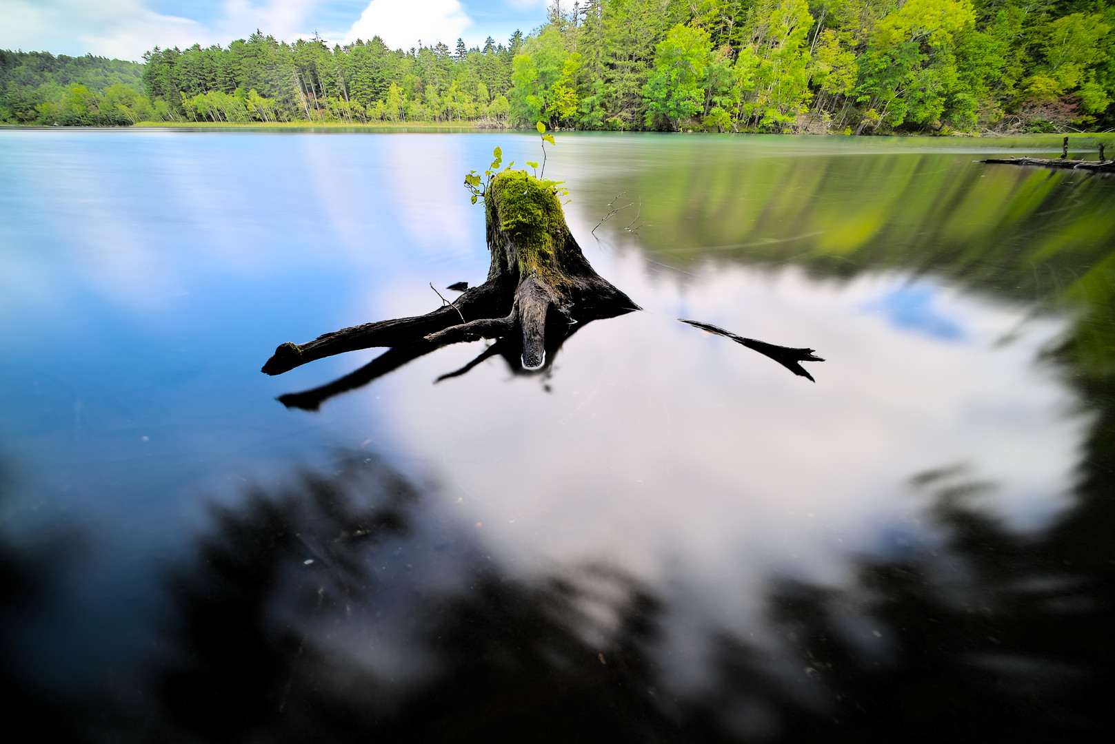 2014/9/15 オンネトーにて α7S + ULTRA WIDE HELIAR 12mm F5.6 Aspherical II 雲を映し込んで白くなっている部分の切り株が筋斗雲に乗った孫悟空のようにも見えませんか?