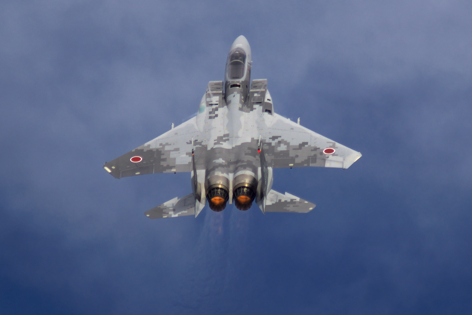 全体的にうす雲が覆っていますが、場所によっては青空が見えました。青空に向かって駆け上がる、303飛行隊の60周年記念塗装機(デジカモ機)の機動飛行。