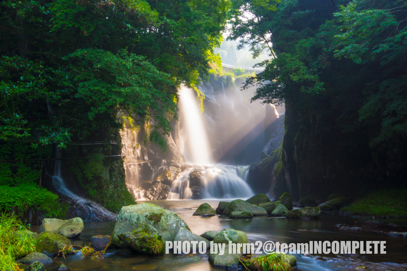 人里離れた滝に降り注ぐ 神秘的な朝の日差し。