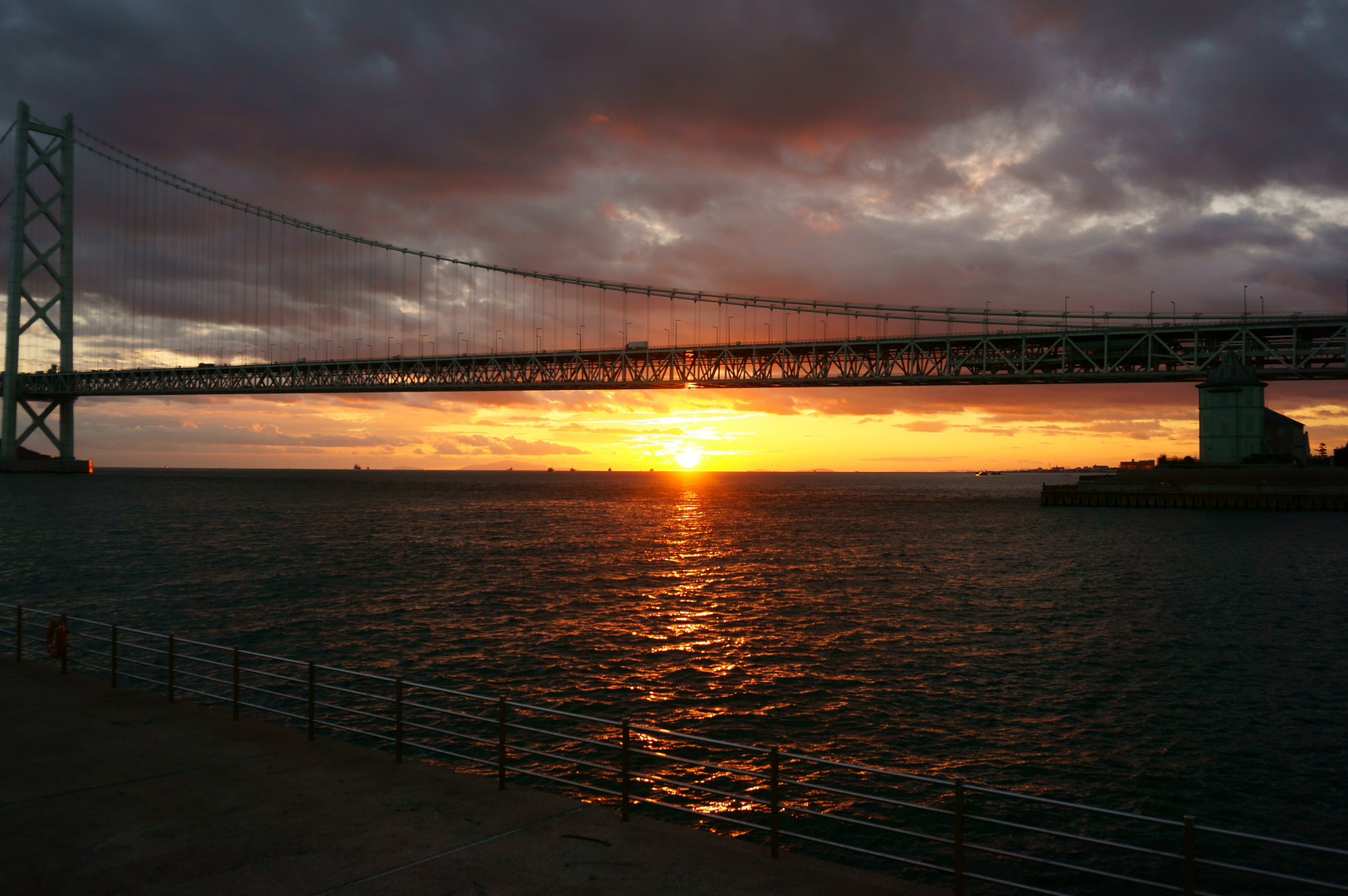 明石海峡大橋と瀬戸内海に沈む夕日です。