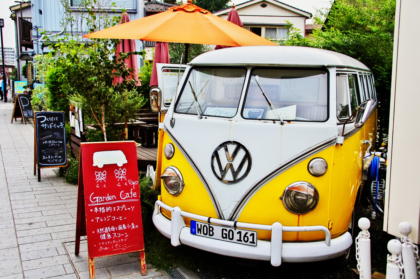 川越、菓子屋横丁の側にパン屋さんがやっている、カフェがありますぅ。 黄色のフォルクスワーゲン、トランスポルターが、良い味出していますねぇ~