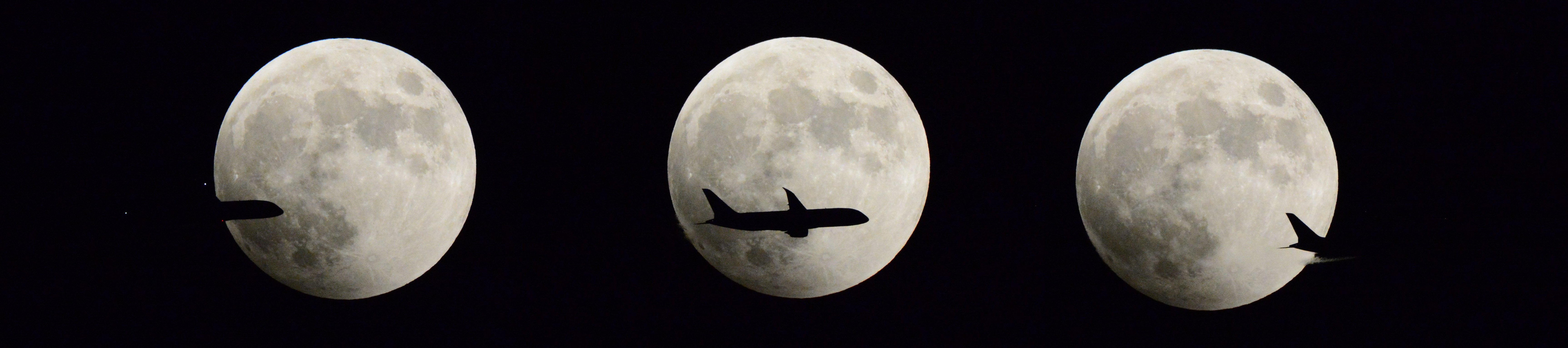 皆既月食の始まりに,成田のジェットが飛び込んできました。 右はジェットの排気ガスが見えます。