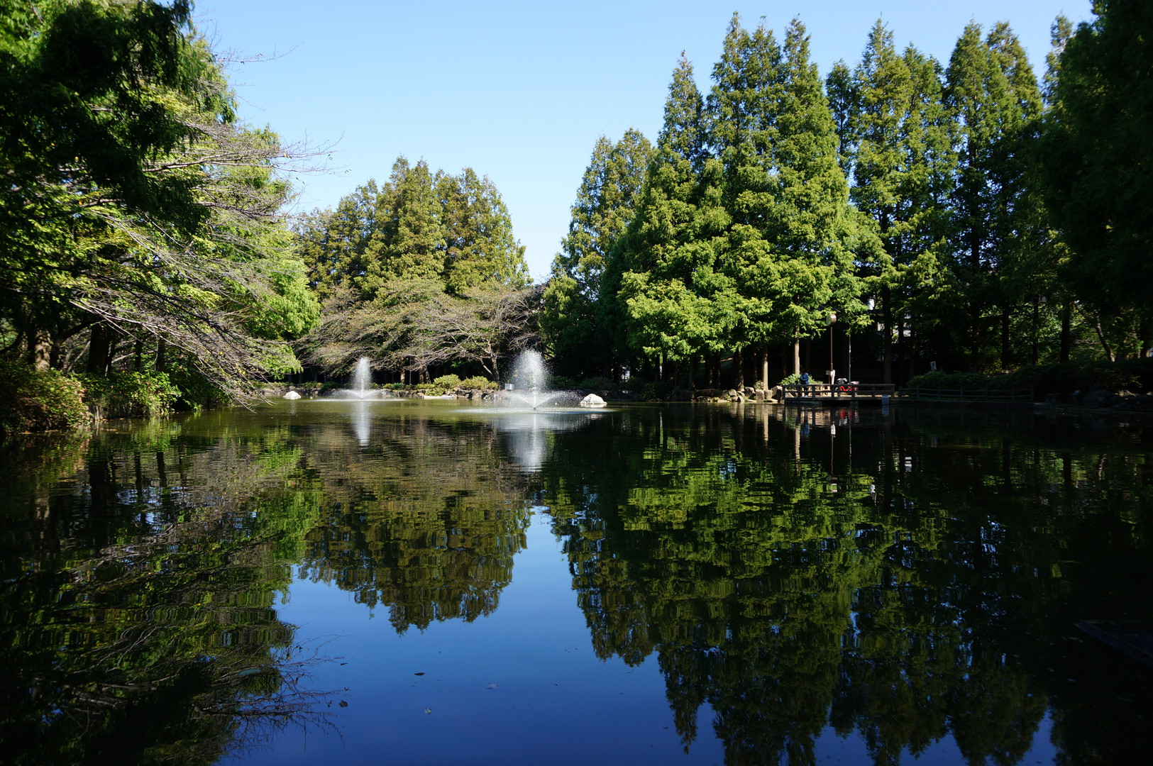 念願の一眼を買いせっかくなので近くの公園を散歩してみました。 ちょうど天気もよく池を見てみると水面も穏やかで向こう側の木々と青空が綺麗に写っているではありませんか!一眼の勉強がてらパシャリ…