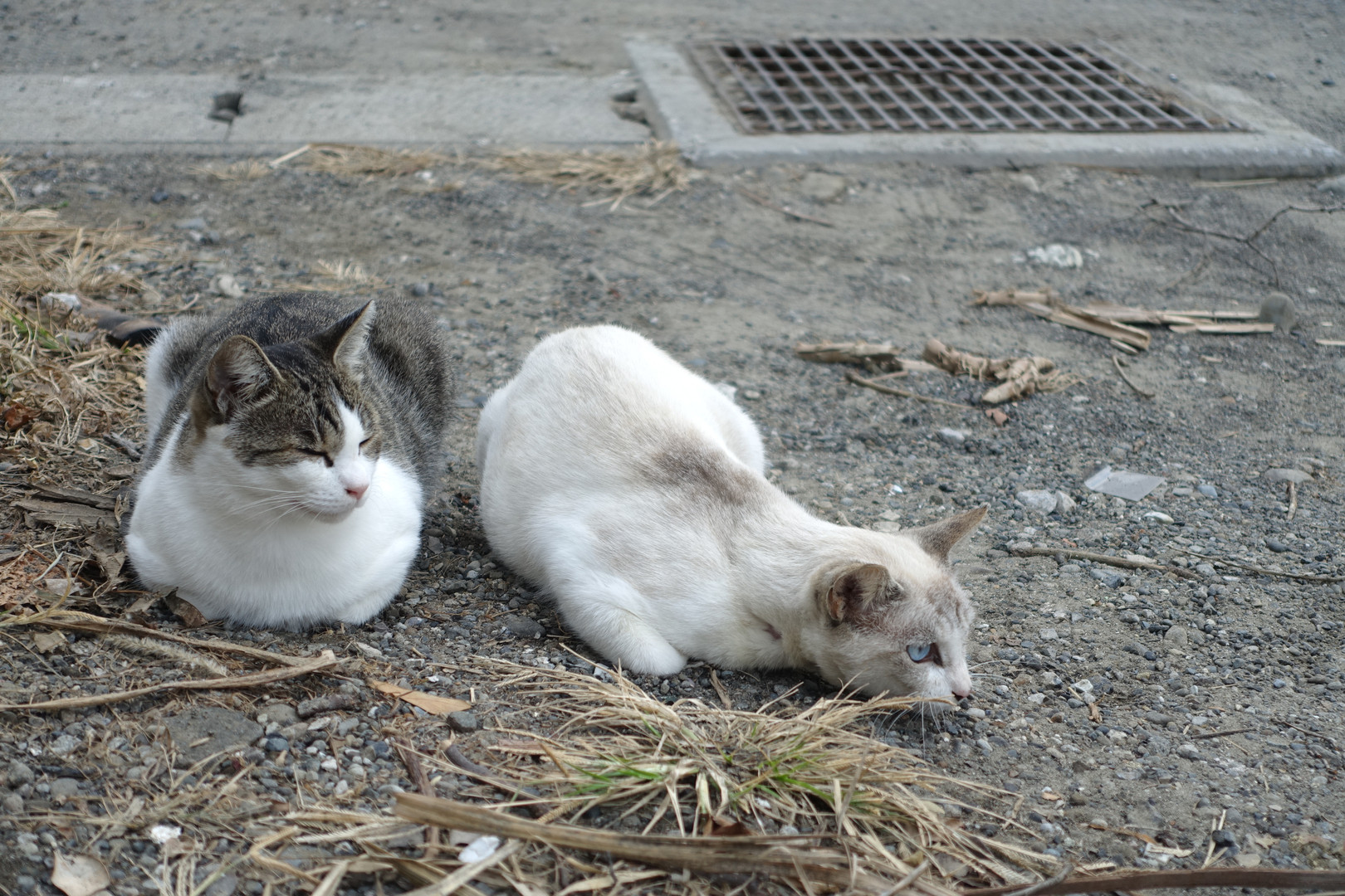5mぐらい先にもう1匹猫がいました。 それに対峙する2匹。 警戒する猫とまったりする猫。 猫も人間も性格は色々ですね^^